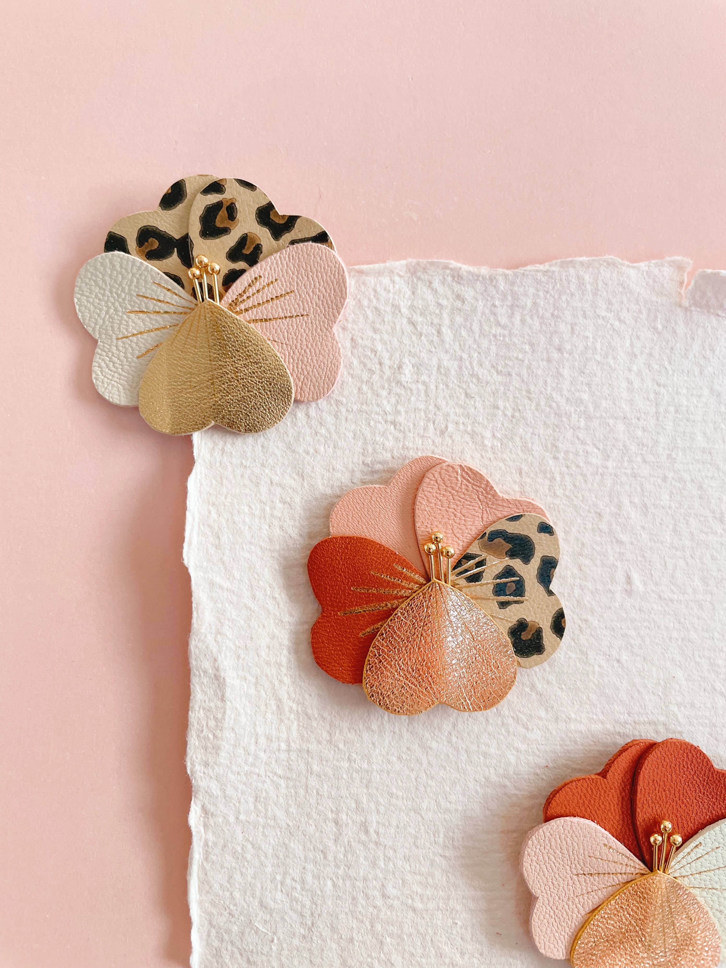 An elegant and distinguished thought. Handcrafted in my workshop in Hauts-de-France, this flower brooch is made from upcycled leather, delicately hot-gilded with real gold. Available in timeless shades – ivory, ecru, nude, navy blue, and golden touches – each model is unique and measures approximately 4 cm. Discreet and sophisticated, it adds a subtle floral touch to a blouse, jacket, or coat, and can also be attached to a bag or shawl. An easy-to-match piece of jewelry, designed as a poetic and elegant accessory. Ideal for concept stores, museum shops, and spaces dedicated to refined gifts. 📦 Neatly presented on a small gift-ready card 🇫🇷 Handmade in France, in a workshop labeled as an art craft.