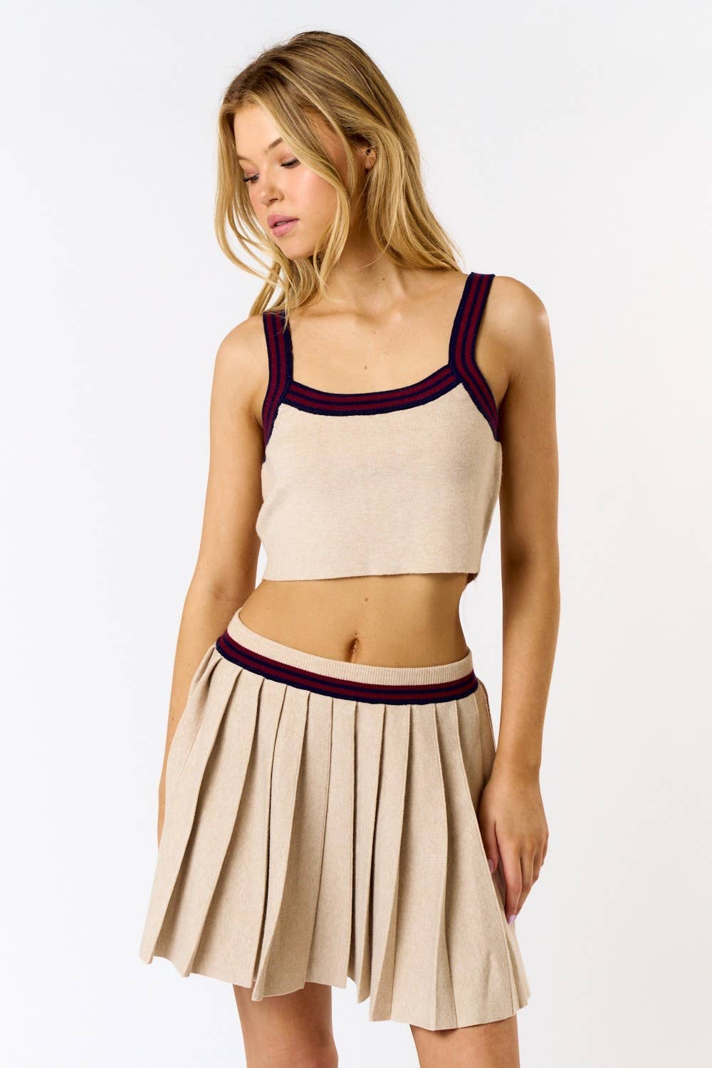 - Style No. : ST3756TF. This knit top and skirt set brings sporty charm with a chic twist. The cropped top features a collared neckline and ribbed texture, while the pleated mini skirt flows effortlessly for a flirty silhouette. Perfect for casual outings or dressed-up sporty looks. Pair with sneakers for a playful vibe or heels for a sleek finish.