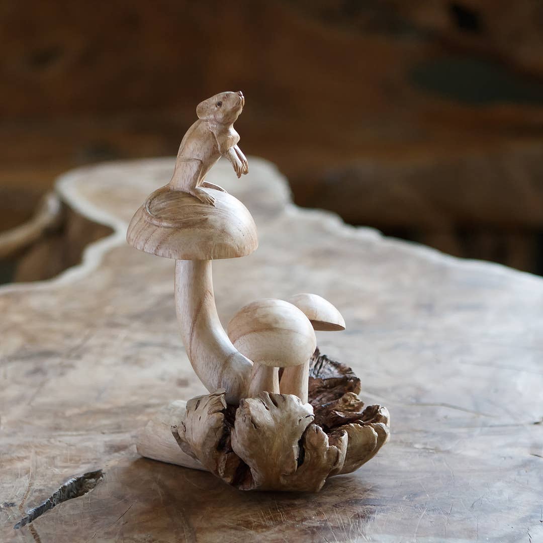 (5) Wood Dot Mushrooms on Driftwood, hand carved from Indonesia. This is a natural item that will have variance in actual size and placement of mushrooms. The quantity of mushrooms will be accurate, and the actual shape of the wood will differ for each individual item. Size is approximately 7-8x5x3.5-4" H. Individual mushrooms are approximately 2.5" tall.