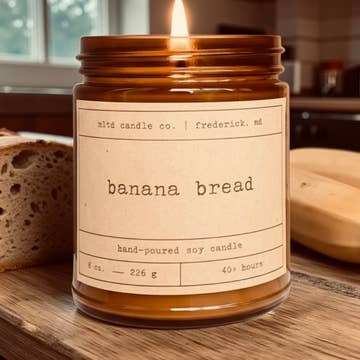 Top notes of toasted walnut and ripe banana combine with nutmeg and sugar for a blend that’s perfectly nutty and sweet. Vanilla and cake base notes enrich the sweetness in this toasty scent. Scent notes: banana, walnut, cinnamon, vanilla, butter CANDLE INFO: • Size: Volume 9oz | 3.06W X 3.5H • Wick: Cotton (Lead and Zinc Free) • Wax: Coconut Soy | Vegan, Non-GMO, Kosher • Premium Fragrance Oil • Gluten Free, Phthalate Free, Non-Toxic, Cruelty Free • Made in Owensboro, Kentucky