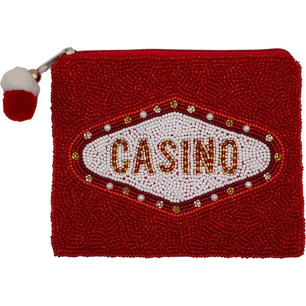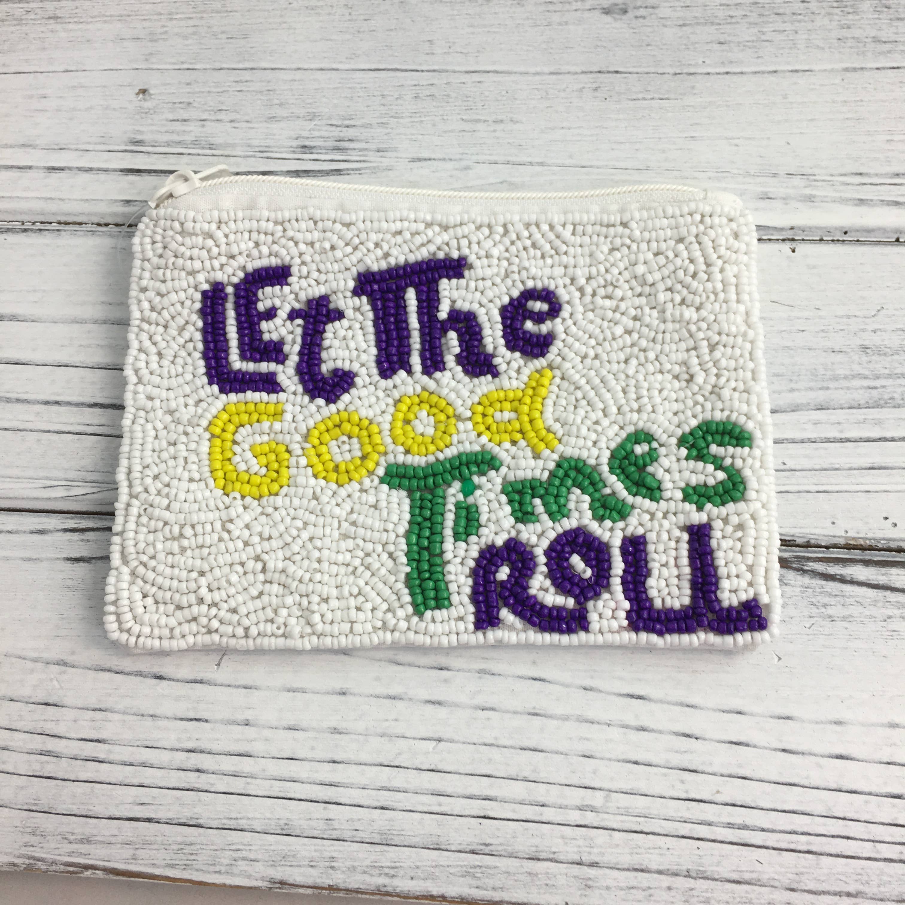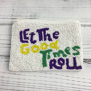 Get ready to celebrate in style with this bold Mardi Gras-themed pouch, featuring vibrant, hand-beaded lettering in purple, green, and gold on a shimmering black sequin background. This fun and festive pouch is perfect for carrying your small essentials during parades, parties, or any event. The secure zipper closure keeps your belongings safe while adding a touch of glam to your look. Whether you're out on the town or need a stylish accessory, this pouch brings the festive Mardi Gras spirit wherever you go.