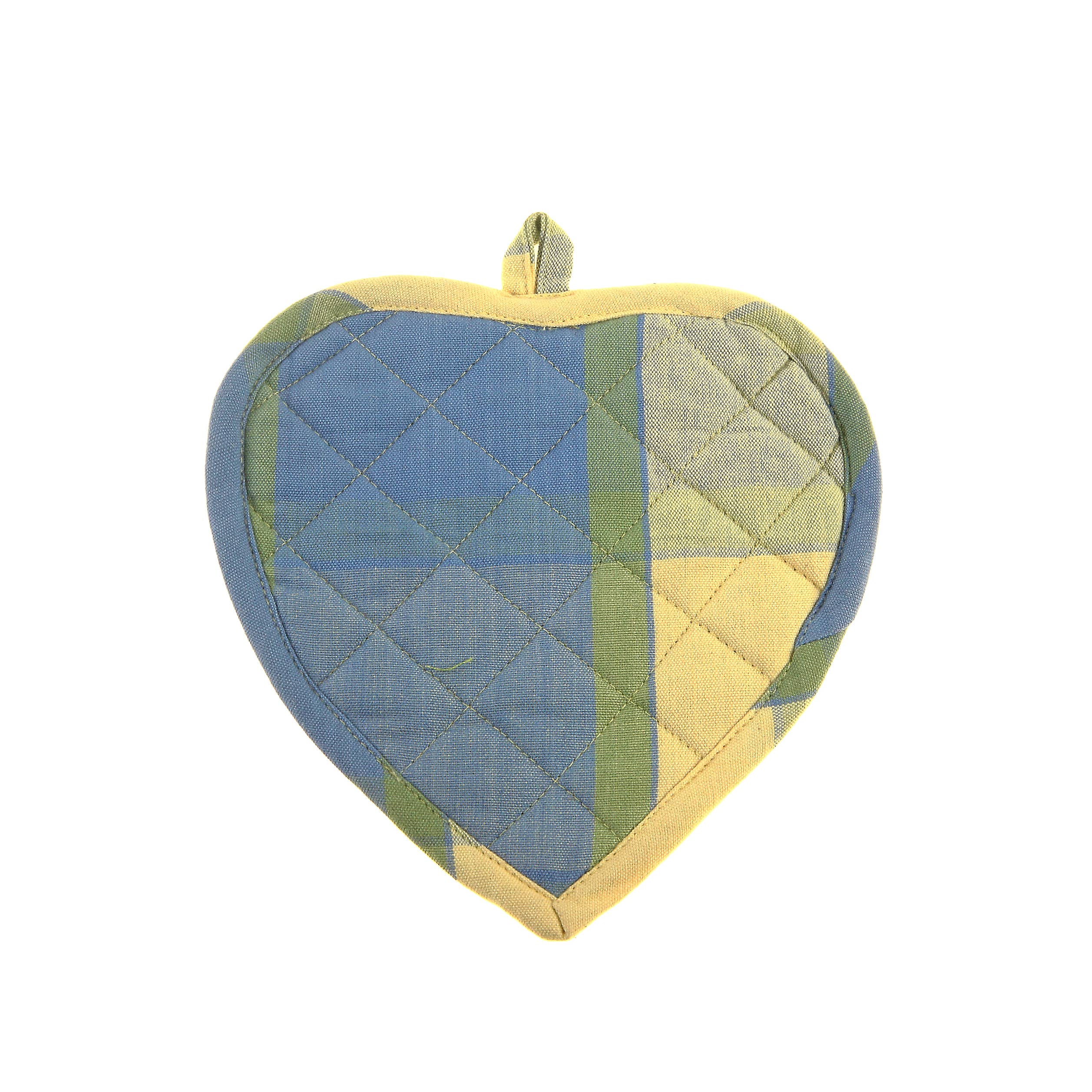 Heart shaped cotton potholder with pockets for fingers and thumbs. Sewn from assorted handwoven fabrics, some printed, some striped creating a beautiful assortment. A kitchen game changer says Ganeshee Michele! She would know, she’s an awesome cook. Potholder measures ~ 9″ X 9″, Assorted colors & patterns.