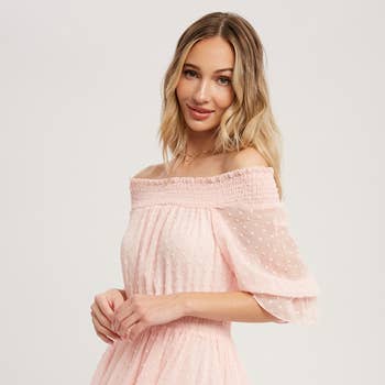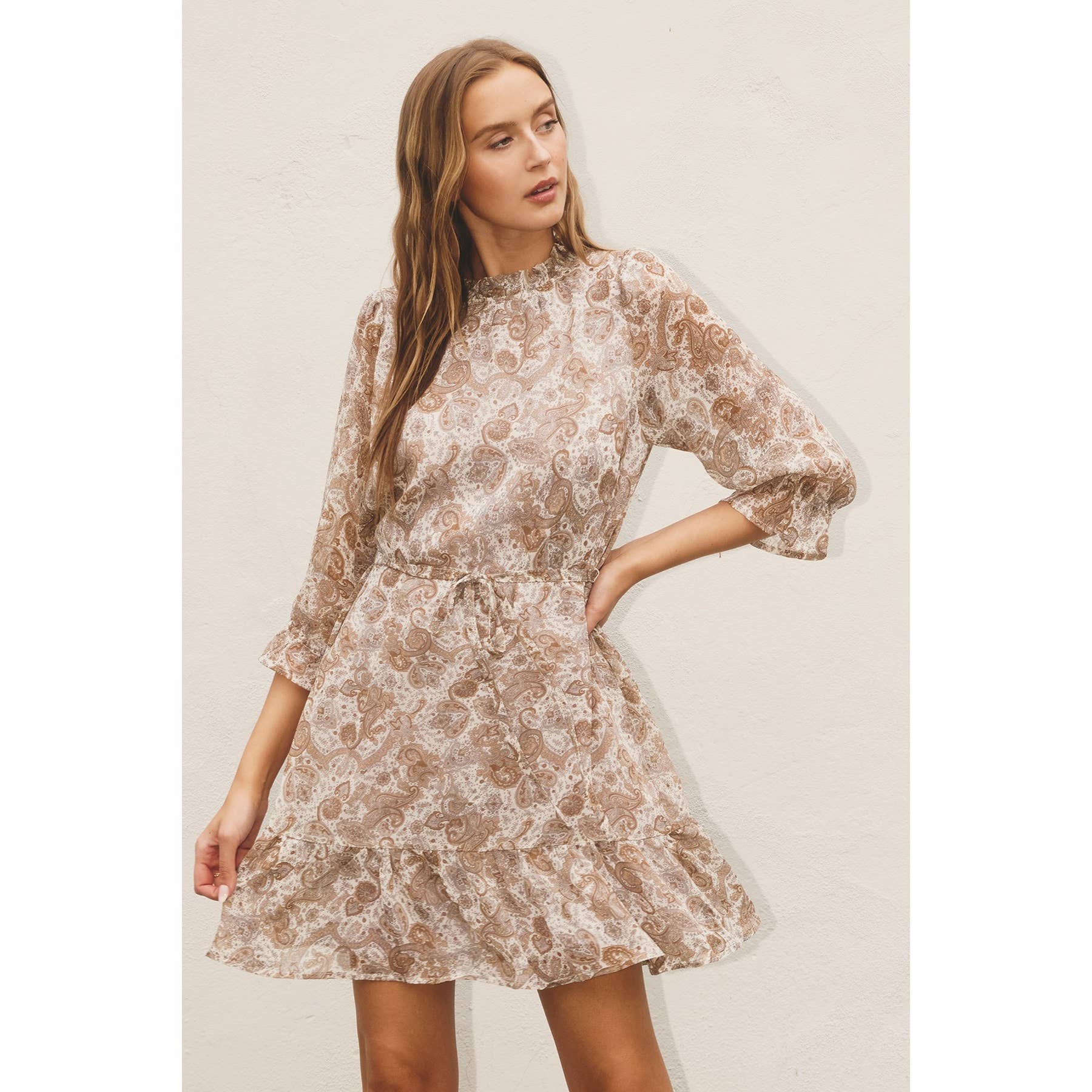 -Style No.:JD2443-5 Embroidered tiny daisies and eyelet baby doll dress. It displays a square neckline, 3/4 puffy sleeves, and two bust darts. It also has an empire gathered waist and a back zipper for off/on access. Storia