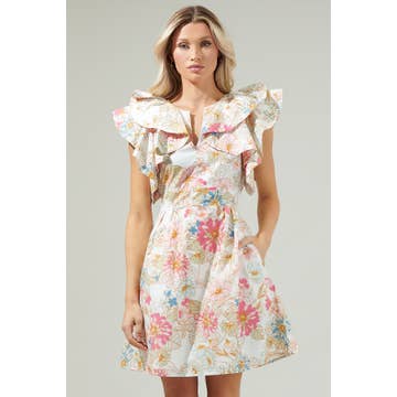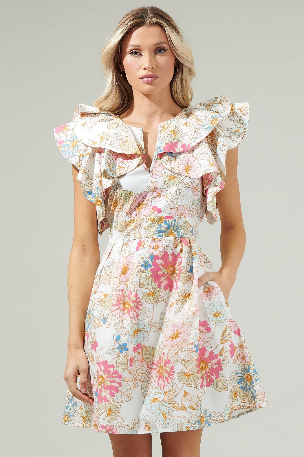 PINK MULTI FLUTTER SLEEVES PLEATED DETAIL MINI DRESS FD35205 for wholesale on Faire1