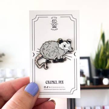 A satisfied opossum dressed as a flannel moth. Measurements: approximately 1.5" by 1.25" This pin was printed on responsibly sourced maple veneered MDF with my original, hand-drawn illustration.