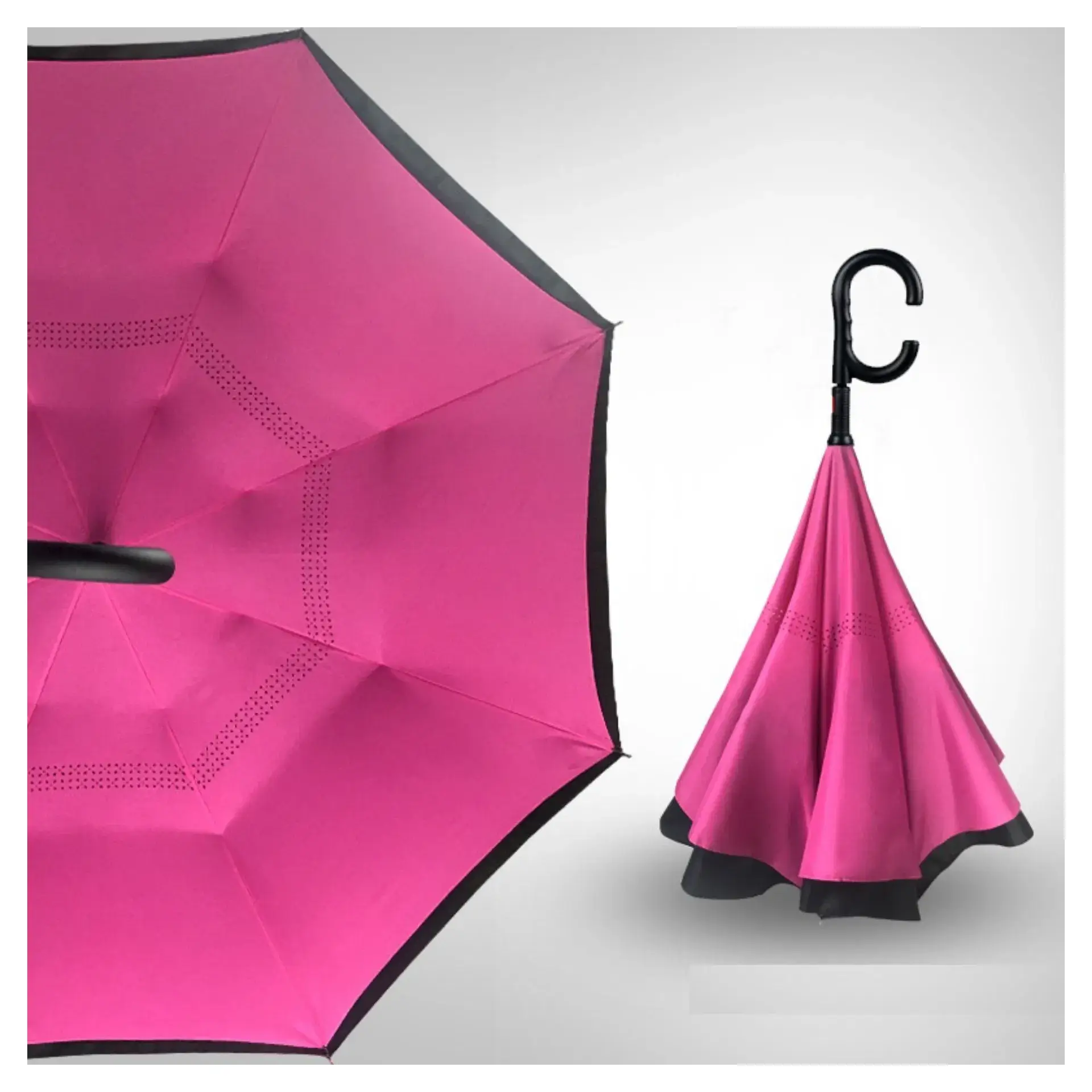 This is an upgraded version of our Popular Upside Down Umbrellas . It works with Auto-opening Mechanism Button which makes it easier to open . The New designed C Handle will make it also easier/ more comfortable to hold or carry the umbrella. Umbrella length :circa 79 cm, Diameter : circa 107 cm . Umbrella Weight: 0.55 kg Minum order for the Long umbrella is 2 per colour. There is a requirement of 12 pcs for Long umbrella (you can mix and match with different styles)when you place an order.