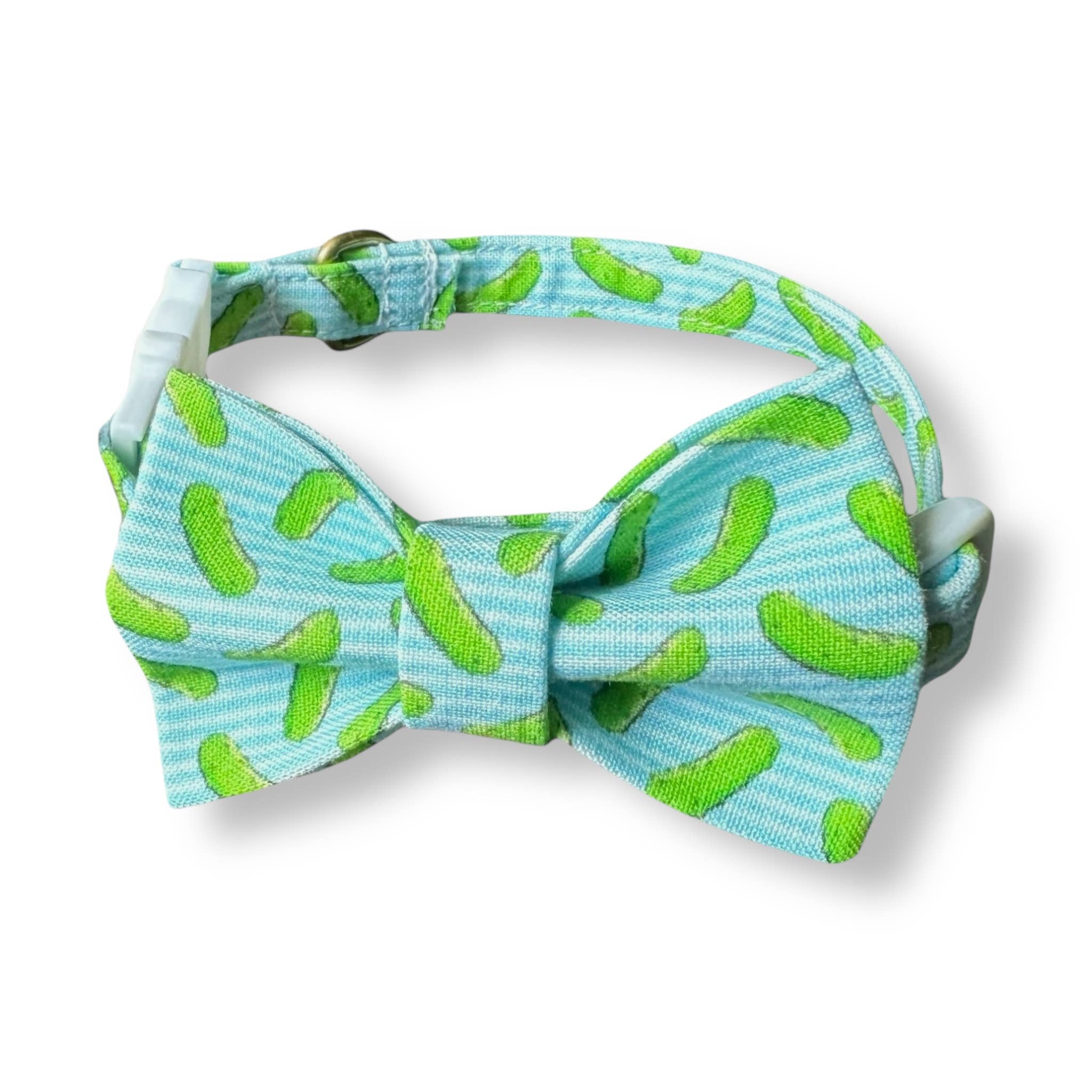 Adjustable. Made with quilting cotton fabric. D-Ring attached for tags. Comes with matching bow tie that is removable. Cat Collar - Fits 8" - 12" neck size, breakaway buckle. 3/8" wide. Comes with a labeled tag with a peg hole for easy merchandising. Hand wash with soap and warm water. Hang dry.