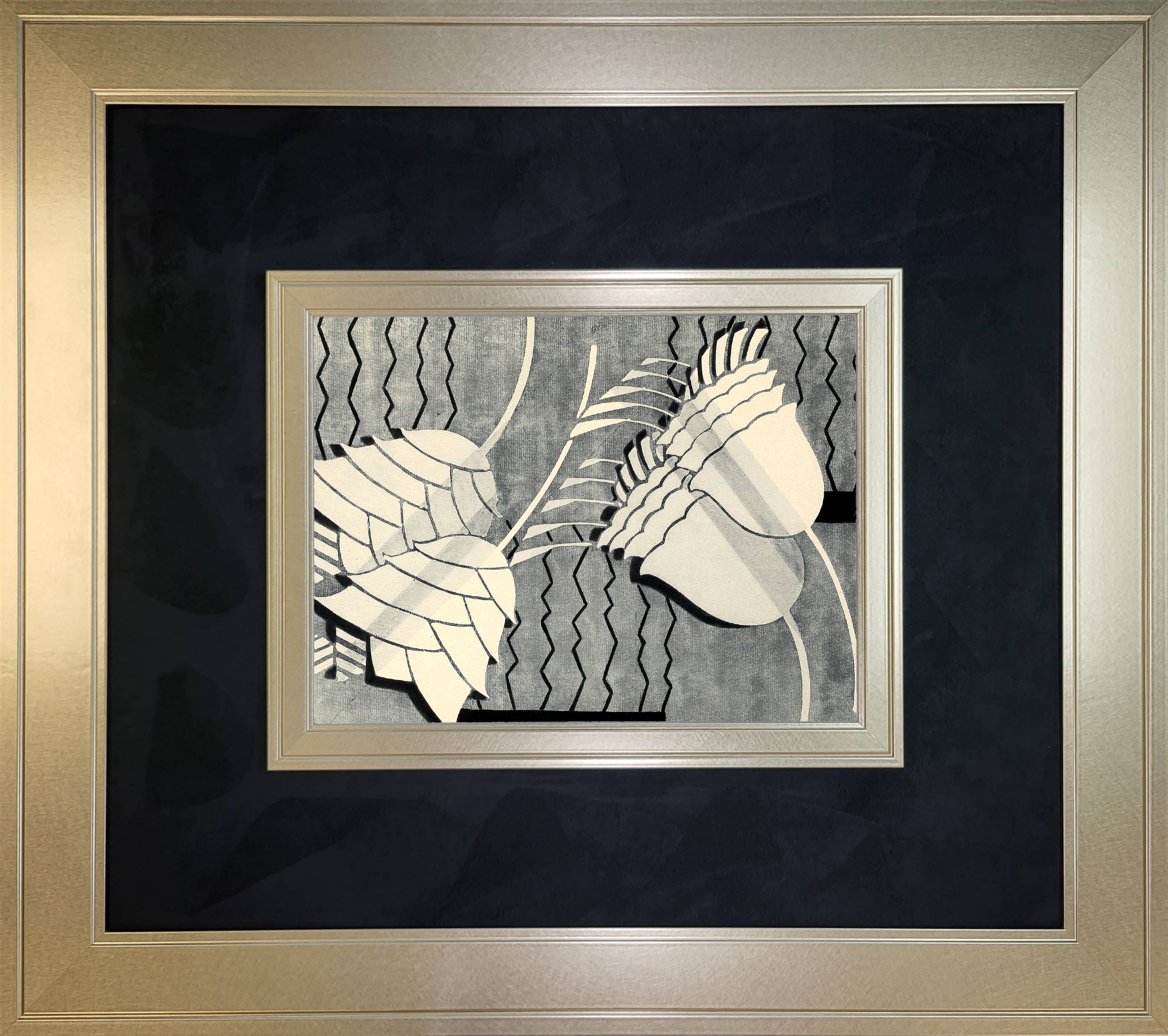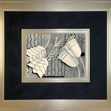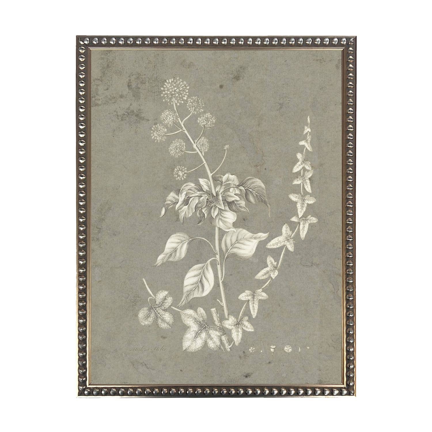 Taupe and Cream Florals F on distressed background in wooden frame behind glass