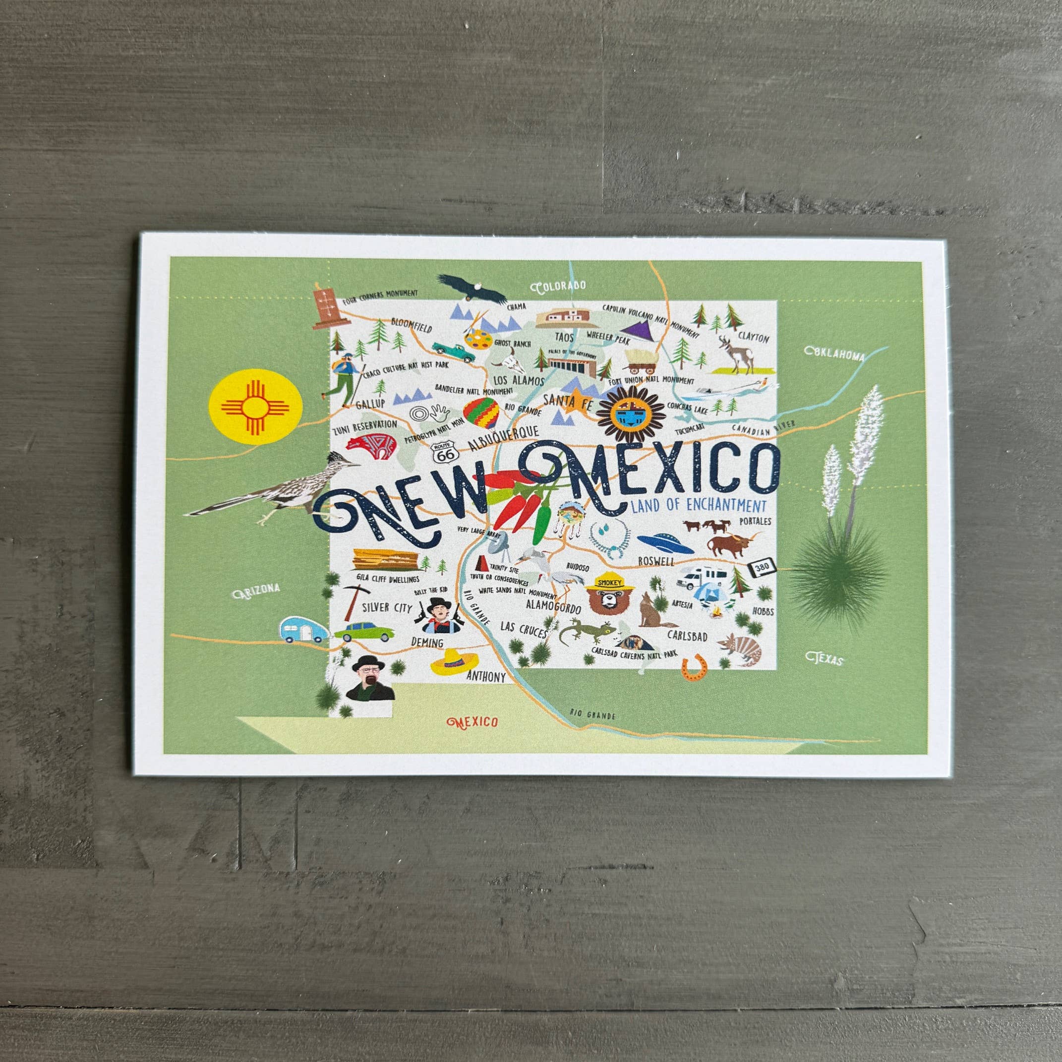 Celebrating the fact that New Mexico and the Southwest is basically chock full of aliens. Also available as a T-shirt, magnet, greeting card and sticker. 4x6 postcard printed on 96 lb. premium glossy cardstock. Designed with joy exclusively by Colossal Sanders.