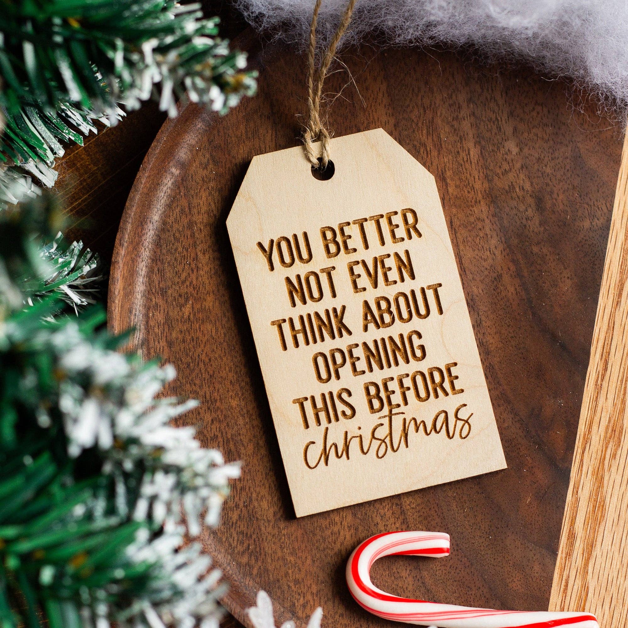 These funny wooden ornaments make an adorable addition to your Christmas tree or holiday decor! Give your tree some personality by choosing your favorite sayings or we can create a custom saying for you! These make for the best gift for friends, family and coworkers! ♥ Choose your favorite sayings from our drop down menu ♥ Want a CUSTOM saying? Choose "customize" from the drop down menu and add what you would like it to say in the personalization box! ♥ Made from Unfinished Baltic Birch PlyWood ♥ Dimensions VARY based on length of the saying! Ornaments are 1/8” thick, width ranges from approximately 2.5" - 5" wide and height can vary from around 1.75"-2.25". ♥ All wooden ornaments come with rustic bakers twine as the hanging ribbon (length of this can vary) ♥ Laser Engraved ♥ Each ornament is one-of-a-kind, wood grain and color WILL VARY slightly on each one which adds to the natural beauty and uniqueness of the wood! Darkness of etching may also vary slightly.