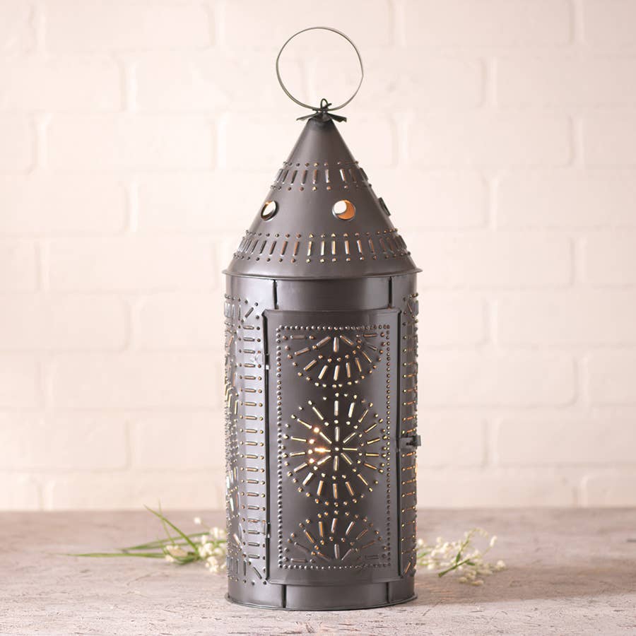 From traditional to primitive, Irvin's Country Tinware offers a selection of decorative punched tin pieces for your decorating needs. Our traditional Revere lanterns offer a beautiful punch pattern to illuminate the background of your wall when place on a counter or shelf. Item Details: Measures 18-Inches high and 6-Inches diameter; E12/Candelabra socket, 1 x 25 watts maximum wattage; Wired with 7-foot cord and line switch; Plugs into wall outlet; UL-CUL listed for dry locations; Made in the USA