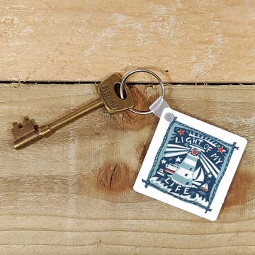 Our popular keyrings are now being produced inhouse using the latest sublimation technology. This design is called Light of my Life. It features a lighthouse shining out over boats with starts and a rope design border. Made from hard wearing 4 mm deep plastic with a metal split ring. The design is on both sides of the keyring. A great pocket money gift or stocking filler. This design is also available as a greetings card