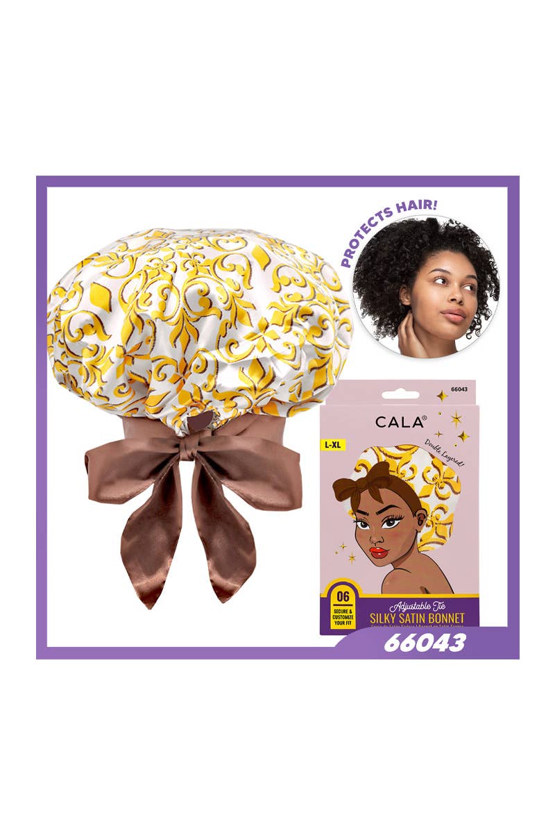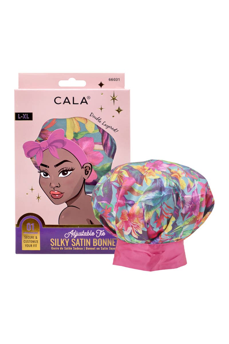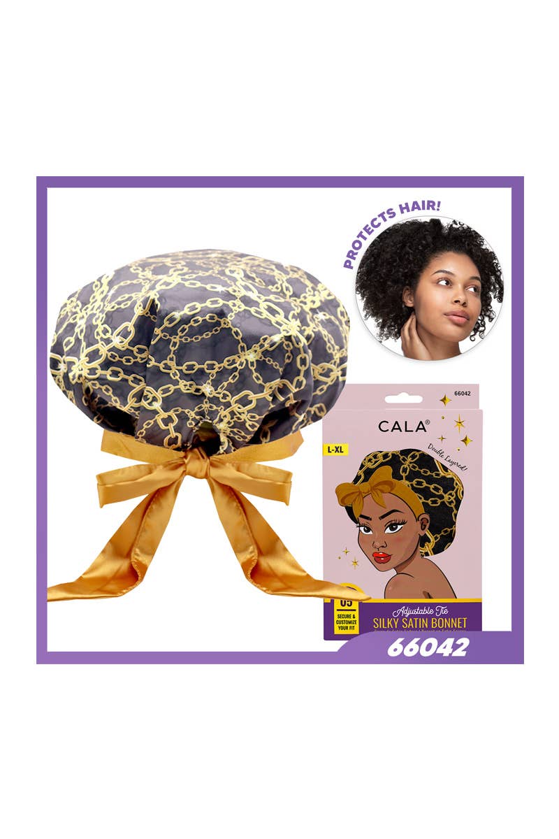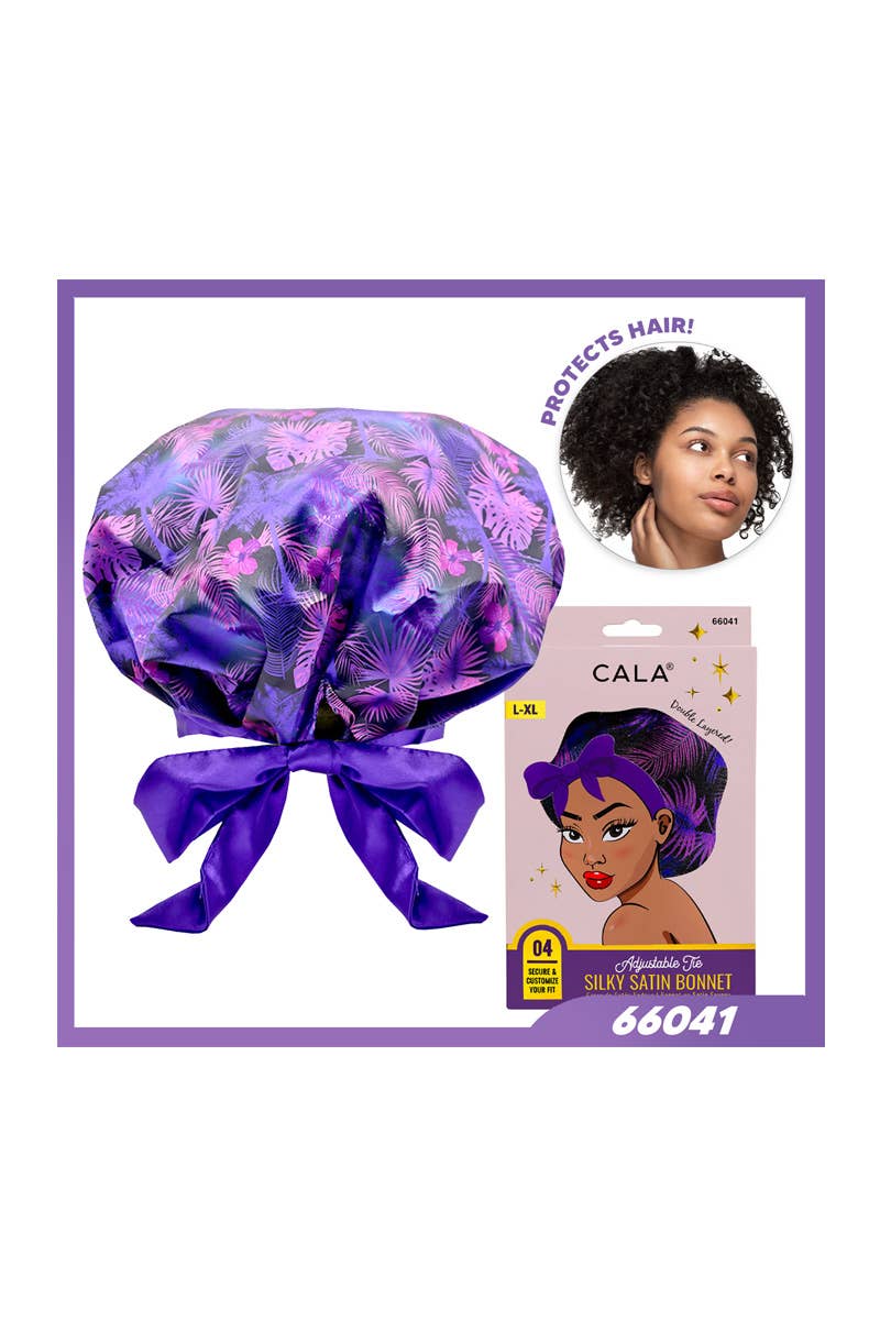 CALA 66033 Adjustable Tie Silky Satin Hair Bonnet Green Leopard Print. This bonnet is thoughtfully designed to offer both comfort and functionality. Crafted from luxurious double-layered satin, it helps to lock in moisture and reduce friction, which can cause frizz and breakage. As a result, hair remains hydrated and soft, promoting healthier hair over time. The adjustable edge control band tie allows to customize the fit, ensuring the bonnet stays securely in place throughout the night without feeling tight or uncomfortable. Perfect for a variety of hair types, L-XL size is spacious enough to accommodate various hair volumes, including long, curly, or voluminous styles, making it versatile and ideal for anyone looking to preserve a hairstyle. 6 pcs in box.