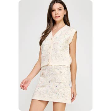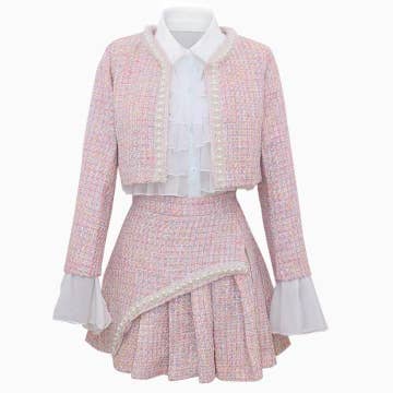 Cream SET003 Co-ord Set Women 3 Pieces Pink Tweed Skirt Set for wholesale on Faire10