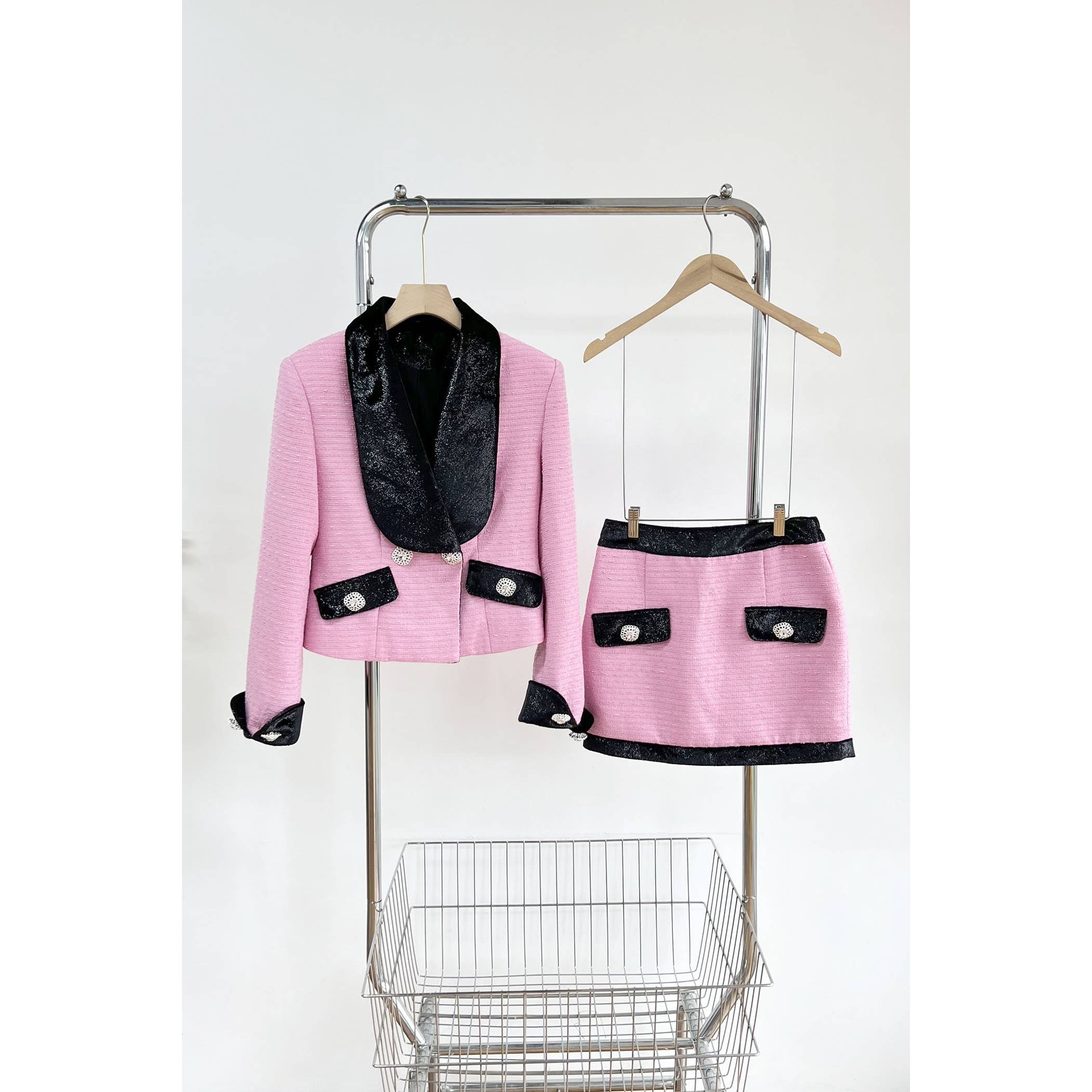 Wholesale SET003 Co-ord Set Women 3 Pieces Pink Tweed Skirt Set