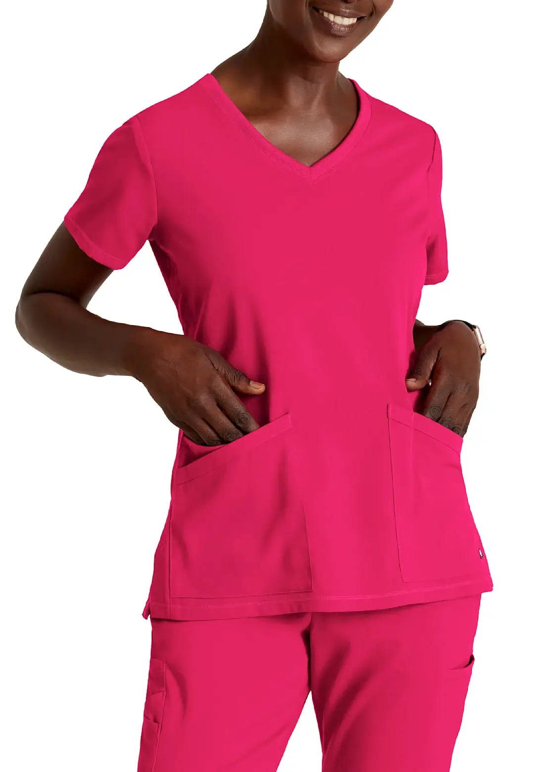 The Wozo Refined V-neck top combines a relaxed, but form-fitting and practical design with durable and luxuriously soft materials. Ideal for long days in the clinic and guaranteed to keep its vibrant color and supple feel after prolonged and repeated use, its proprietary antimicrobial fabric works as hard as you do, wicking away sweat and odor-causing bacteria. Five hip-level drop pockets (two large pockets piggy-backed on the right, and two medium side-by-side pockets backed by one large pocket on the left) enable maximum functionality and cargo-space. A steel loop on the left-breast allows for quick and convenient placement of the wearer’s ID badge Features at a Glance Proprietary Antimicrobial Fabric Mau 4-Way Performance Stretch Technology Odor and fade resistant Luxuriously soft, supple feel Advanced Flexibility Easy to care V-neck, form-fitting design