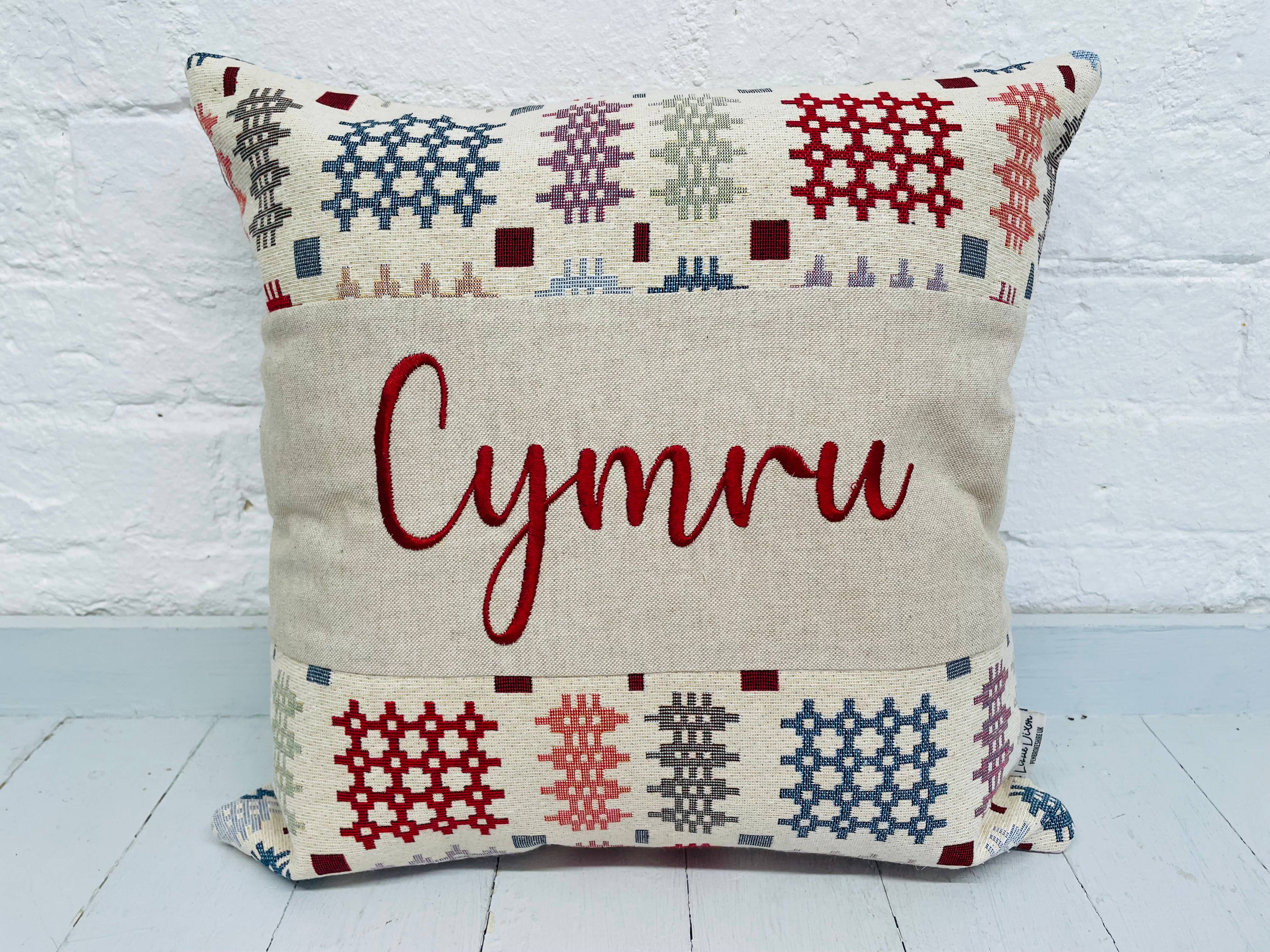 Welsh Blanket style Fabric long cushion. Welsh quote is embroidered on a panel in the middle with the Welsh blanket on both sides and reverse. Quality finish with over locked seams. Zip opening at lower edge of cushion cover The positioning of the pattern may vary from the featured photos. Beautiful Handmade Cushion Making a house a home is all about adding those cosy finishing touches that make you smile the moment you walk through the door. With ethically sourced feather pads wrapped up warm in 100% cotton, your new cushion is perfect for snuggling up and getting yourself comfy. - Handmade right in the heart of the Pembrokeshire countryside - Mix and match fabrics and bespoke embroidery ensure you get something truly unique - Explore our whole range to see a whole host of colours and patterns that will make your home smile