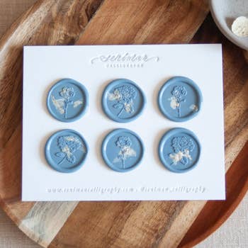 One of a kind hand poured self adhesive wax seal set. They feature vellum wax with real pressed flowers and ferns. The wax seals have a sticky peel off back to make adhering them to envelopes or other paper easy. Each wax seal is unique, so it may not perfectly match the one shown in the photo. The design will be the same.