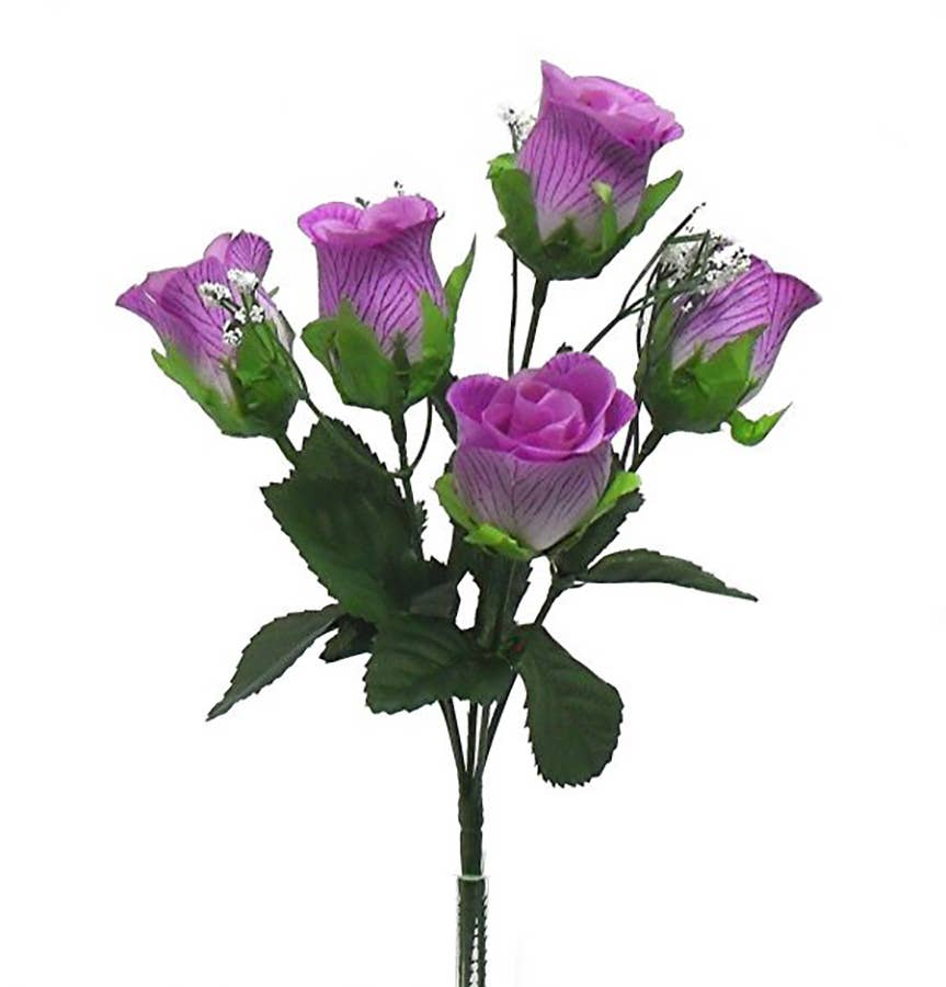 The Purple Pansy Bush accents faux floral arrangements with colorful, realistic style. A textured green stem sprouts green branches adorned with detailed green leaves. Bright faux florals featuring realistic purple and brown petals complete the bush. Measures 12” high by 7” wide by 2” deep.
