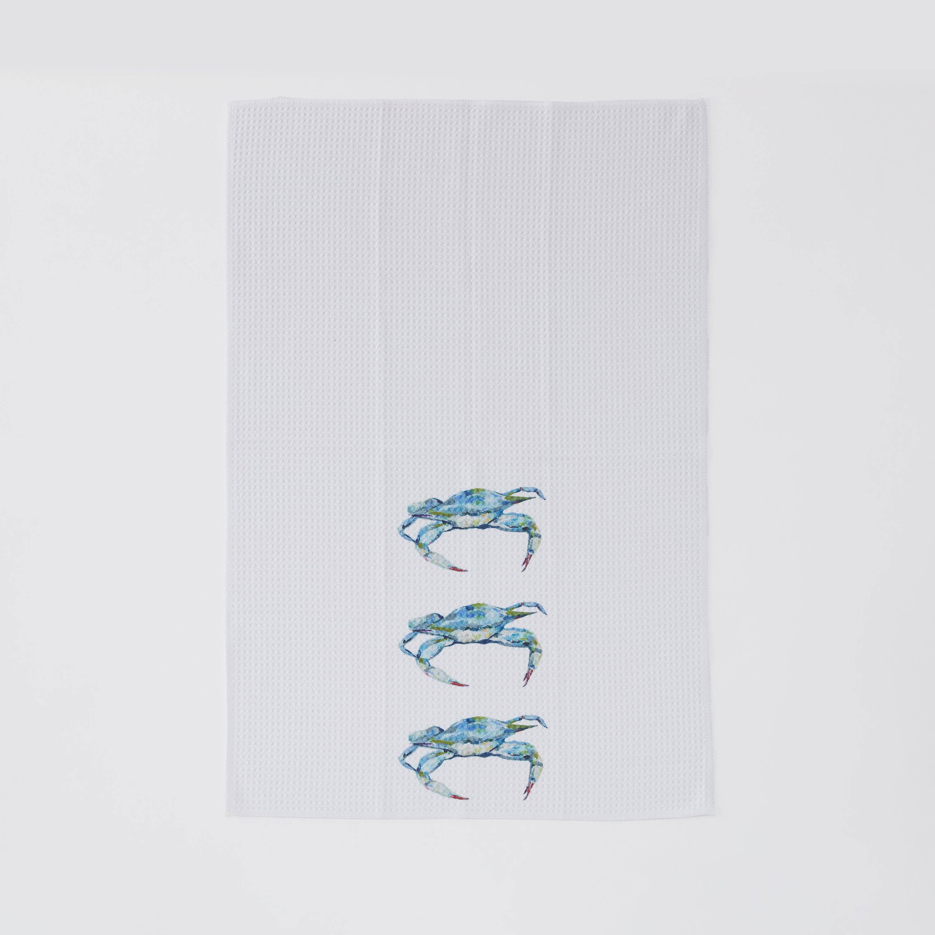 Whether you need a hostess gift or you're just replacing the last towel your husband didn't know was a DON'T TOUCH TOWEL, our tea towels will have you covered! Our Louisiana blue crab watercolor print are sure to be a hit with the beach lovers in your life. Printed on our waffle weave ultra-absorbent microfiber 80% polyester 20% Polyamide towels. Images are sublimation printed for high fade resistance wash after wash. PRODUCT DETAILS Design: Printed on the front of one side Size: WAFFLE WEAVE KITCHEN TOWEL - 16″ x 24″ overall size; 6″x 5″ design area size Care: Machine Wash Cold, Tumble Dry Low Heat Drawn, designed, and sublimation printed by Stephanie Crow. Due to variances in computer color settings colors in product may have a slight variation from depiction on screen. Designed and printed in the USA