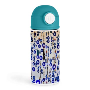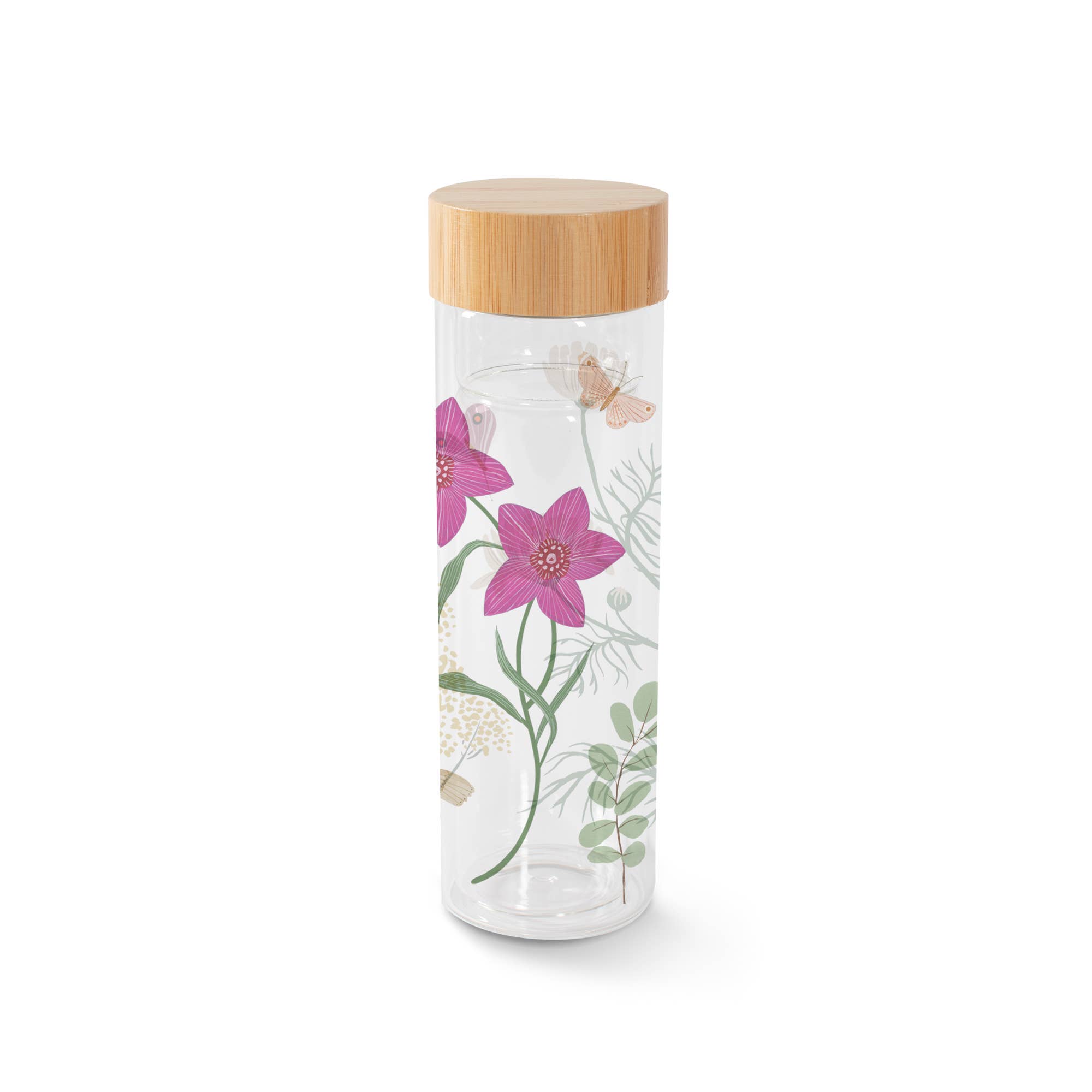 GLASS HYDRATION BOTTLE Double wall glass with bamboo screw top lid featuring artist collaborated design by Megan Galante comes in decorative cylinder gift box packaging.