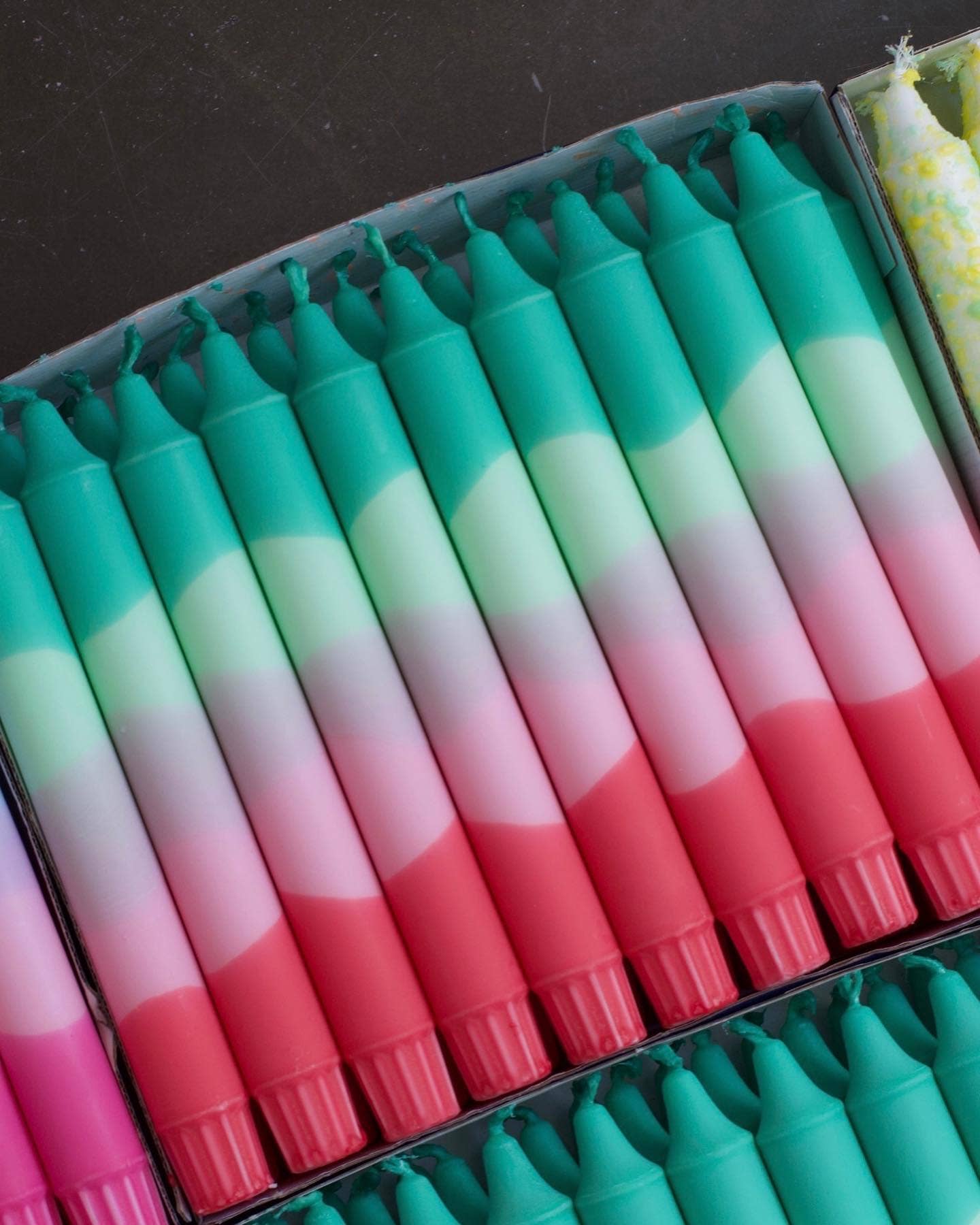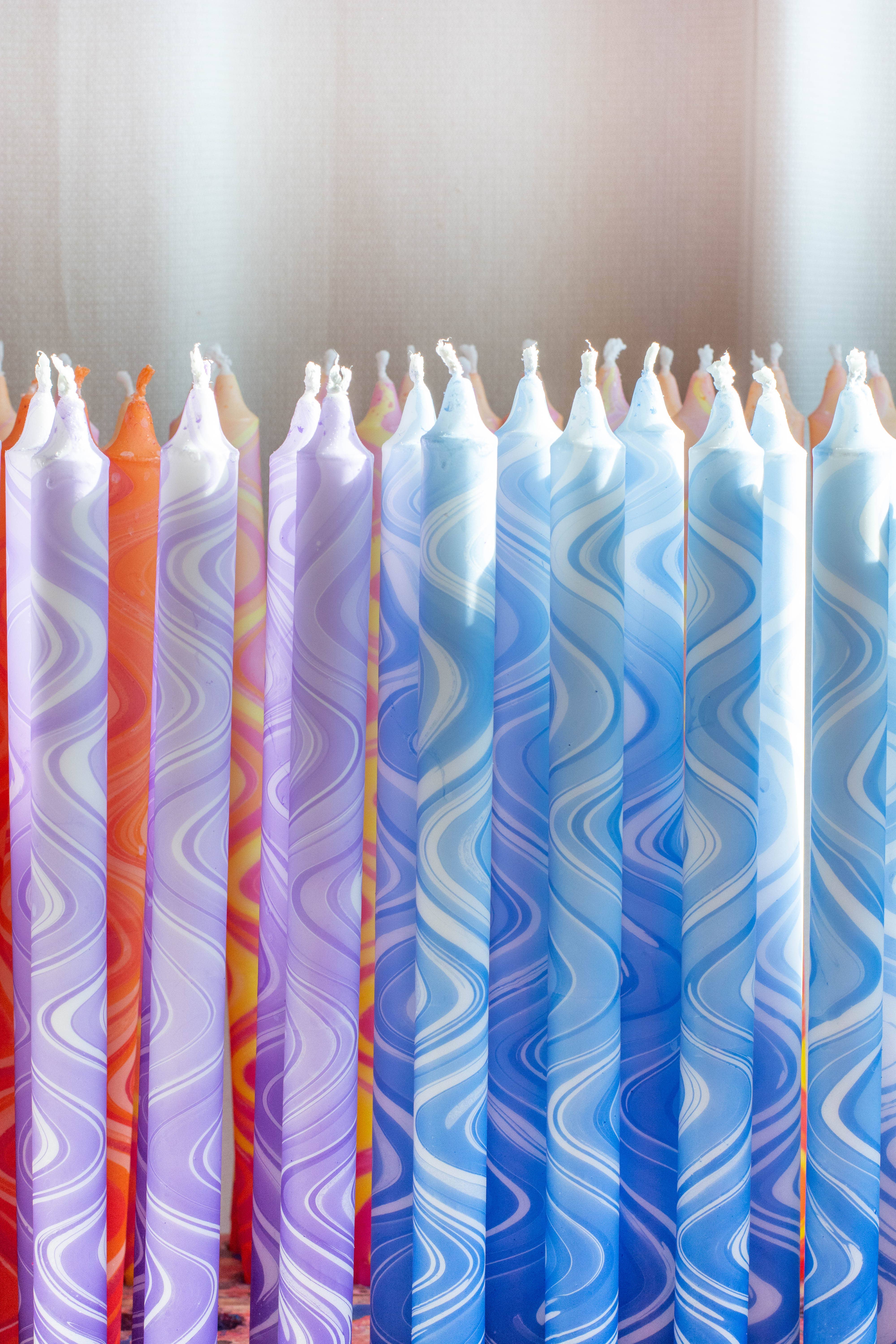 A mix of originally hand decorated 35 cm high table candles in pastel colours. Made and designed with Scandinavian style in Copenhagen, Denmark by Nordtrice Candles. Perfect fit for physical boutiques, interior and flower shops. Candles placed in a glass jar look majestic, colorful and really eye catching. That type of candles is our bestseller! Candles are coming as a mix of minimum 20 colorful pieces ( just like on the pictures). It is also possible to order just one type. Candles are handmade using a traditional dip dye technique thanks to which every candle is unique! Diameter in the bottom is 2.1 cm and made in standard size so it fits to all candle holders. Candles are made of a natural and vegan stearin wax. Stearin wax is "harder" than other waxes such as paraffin, therefore candle would not "flop" or change the shape while being exposed to the heat or sun. Burning time - 10/11 hours Taper candles I Kerzen I Bougie I Candles I Kaarsen I Mini Candle I Scandi
