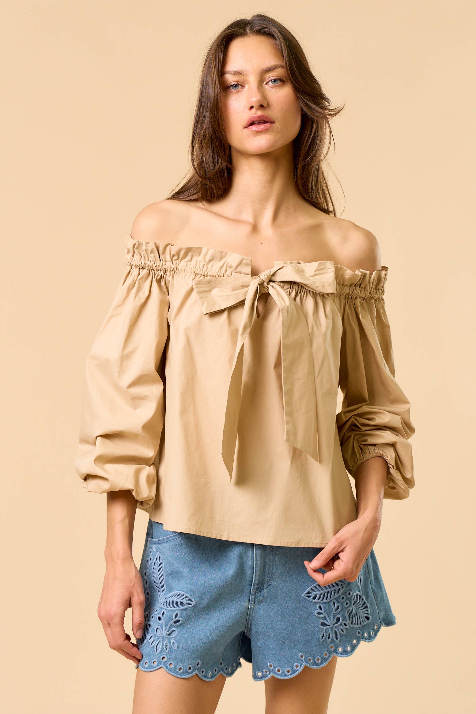 Long Sleeve Sweetheart Neck Front Ribbon Tie Detail Woven Top