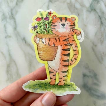 A cute tiger in a little patch of flowers, great for decorating laptops, sketchbooks, water bottles, or anything your heart desires! - 4" long - Matte - Vinyl - Durable, UV Protected, and Waterproof