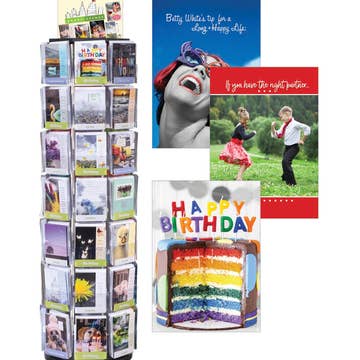 Countertop spinner display holds up to 192 greeting cards or series SK-3000 stickers. Please include a minimum of 96 Greeting Cards or series SK-3000 Stickers (or a combination of the two) when ordering this display. Dimensions: 16" w X 19" h NOTE: Image shown is of our 24-pocket version with 3 tiers of shelves. The 16-pocket display has 2 tiers of shelves. Works with #8490 end-pockets for Stickers, Boxed Notes, or Greeting Cards (sold separately) ONLY SOLD WITH FILLING ORDER OF EARTH SKY + WATER PRODUCTS **Not intended for resale** Please note that we are not a display vendor. We only sell displays when they are filled with our product.