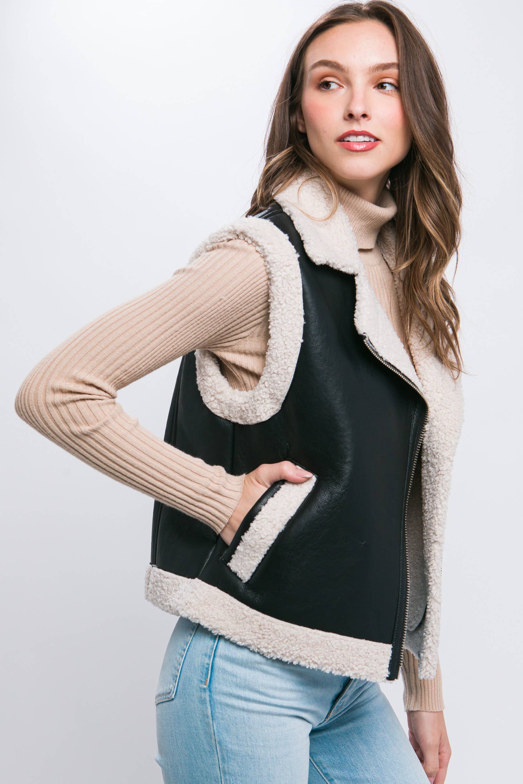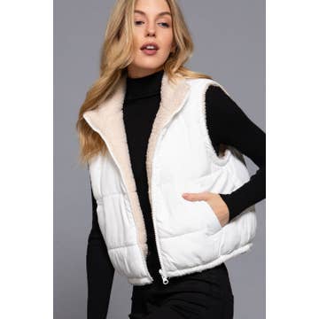Wholesale Reversible Faux Leather-Sherpa Contrast Padding Crop Vest