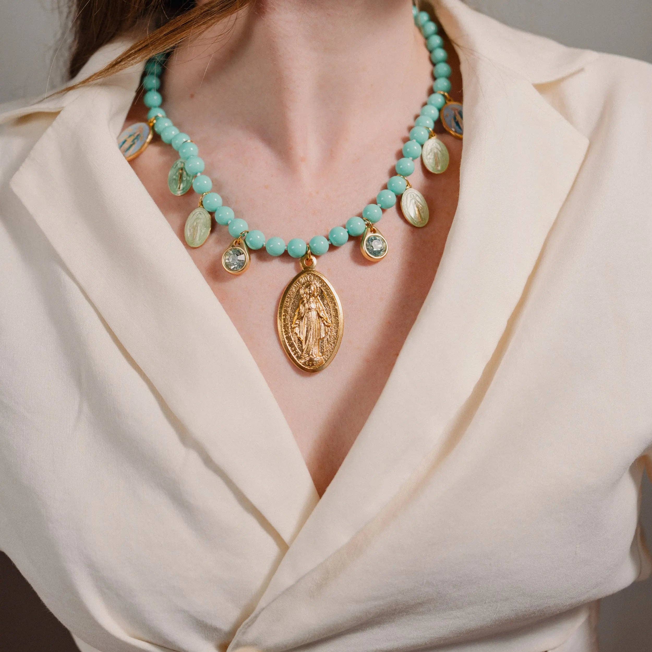 these colorful and cute relic coin pendants are just what you need. they are bold, but yet still so simple. there is two options, a blue mary coin or a green buddah coin. -1 coin in your choice of blue (mary) or green (buddha) on rolo chain every piece of jewelry is handcrafted and/or assembled at bubs & sass. we pay a lot of attention to detail and want our customers to be happy! please reach out if we haven't accomplished this. all of our products are nickel and lead free. thank you for choosing bubs & sass. we are so very grateful.