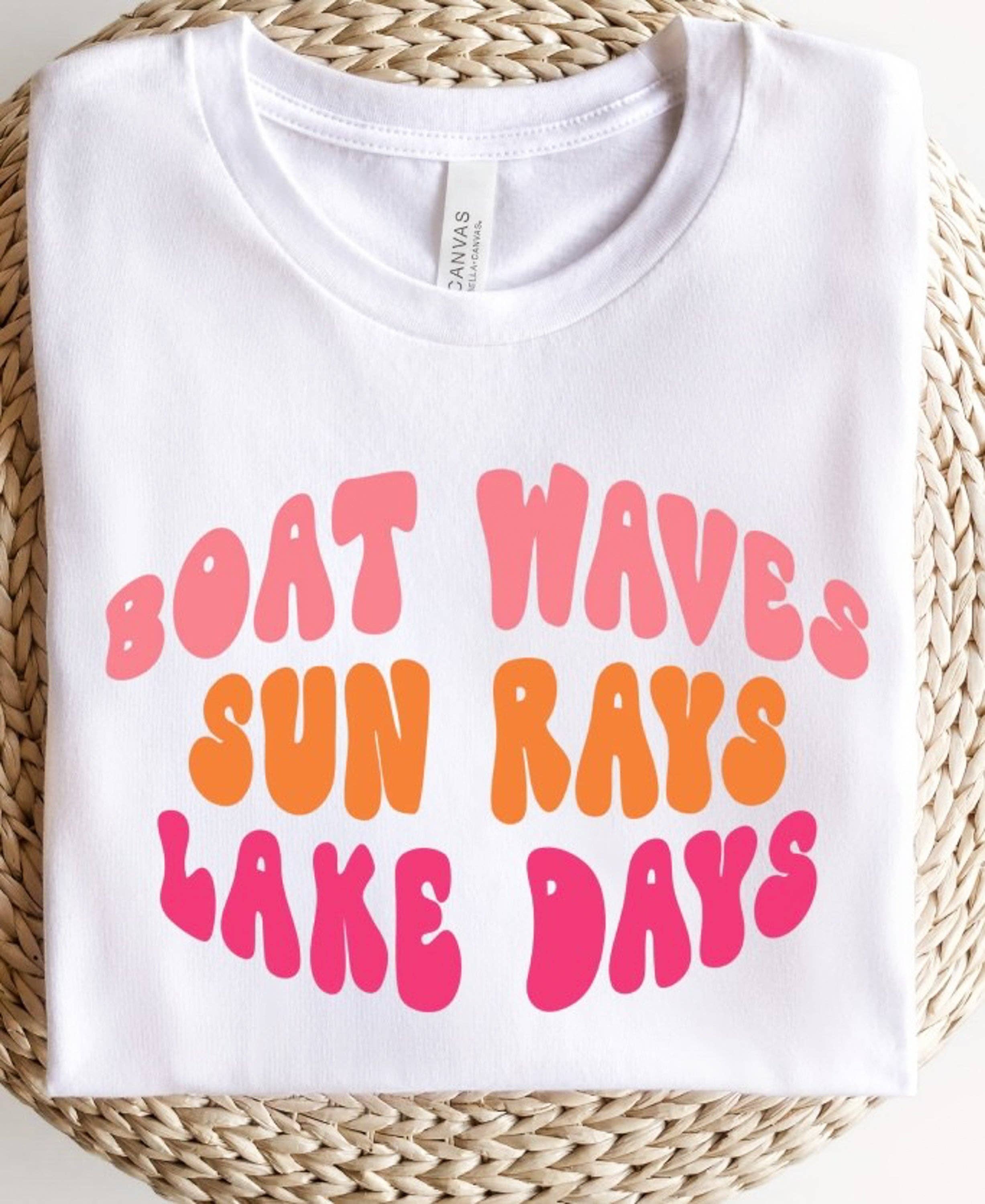 ntroducing our Lake Vibes Graphic Tee, the perfect addition to your summer wardrobe! Made with a comfortable and lightweight material, this tee will keep you cool and stylish while you enjoy your favorite outdoor activities. Featuring a unique and trendy design, the Lake Vibes Graphic Tee showcases retro wavy lines symbolizing water and waves, along with the phrase "Lake Vibes" printed in bold letters. This tee is perfect for those who love spending time by the water and enjoying the beauty of nature. The Lake Vibes Graphic Tee is available in a variety of sizes to fit everyone, from small to XXXL. (Please see the Plus Size SKU listed separately for XXL and XXXL sizes). Most t-shirt colors are 52/48 cotton/polyester blend. Athletic Heather & Black Heather are 90/10 cotton/polyester. White, cream, pink, canvas red, lilac, mint are 100% cotton. Ash is 99/1.