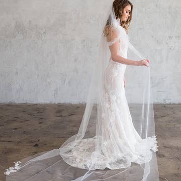 No bridal look is complete without a veil! This gorgeous Cathedral length handmade veil will be the finishing touch on your wedding day. This high quality veil is handcrafted and has a beautiful lace edge.  It's a beautiful addition on your wedding day! 4m long, 2.7m wide, off white, wire comb -- We know firsthand that a bride feels their best when they look their best. The importance of a simple piece, such as a veil, belt or headpiece can not go understated, and will spruce up your gorgeous wedding dress in a way that will make you feel beautiful! The moment you put on your final accessories will truly make you feel like you're ready to start the beginning of your love story.