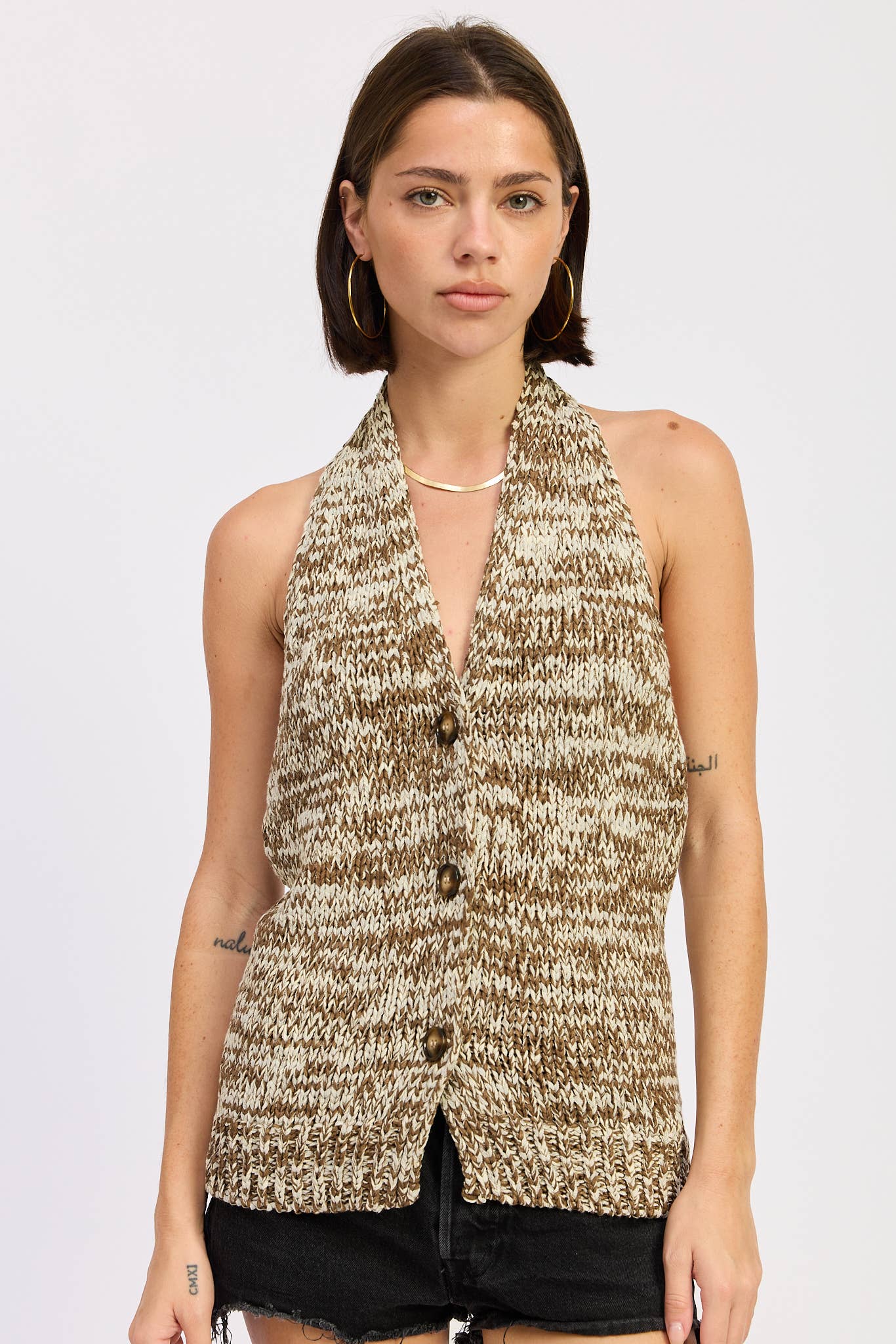 This button down sweater vest top is the perfect lightweight layer for summer. With a sleek, modern design and easy-to-style silhouette, it adds a touch of chic to any look-whether worn solo or layered. A versatile must-have for warm-weather days. - V neckline - Sleeveless - Button down - Front pockets - Knit
