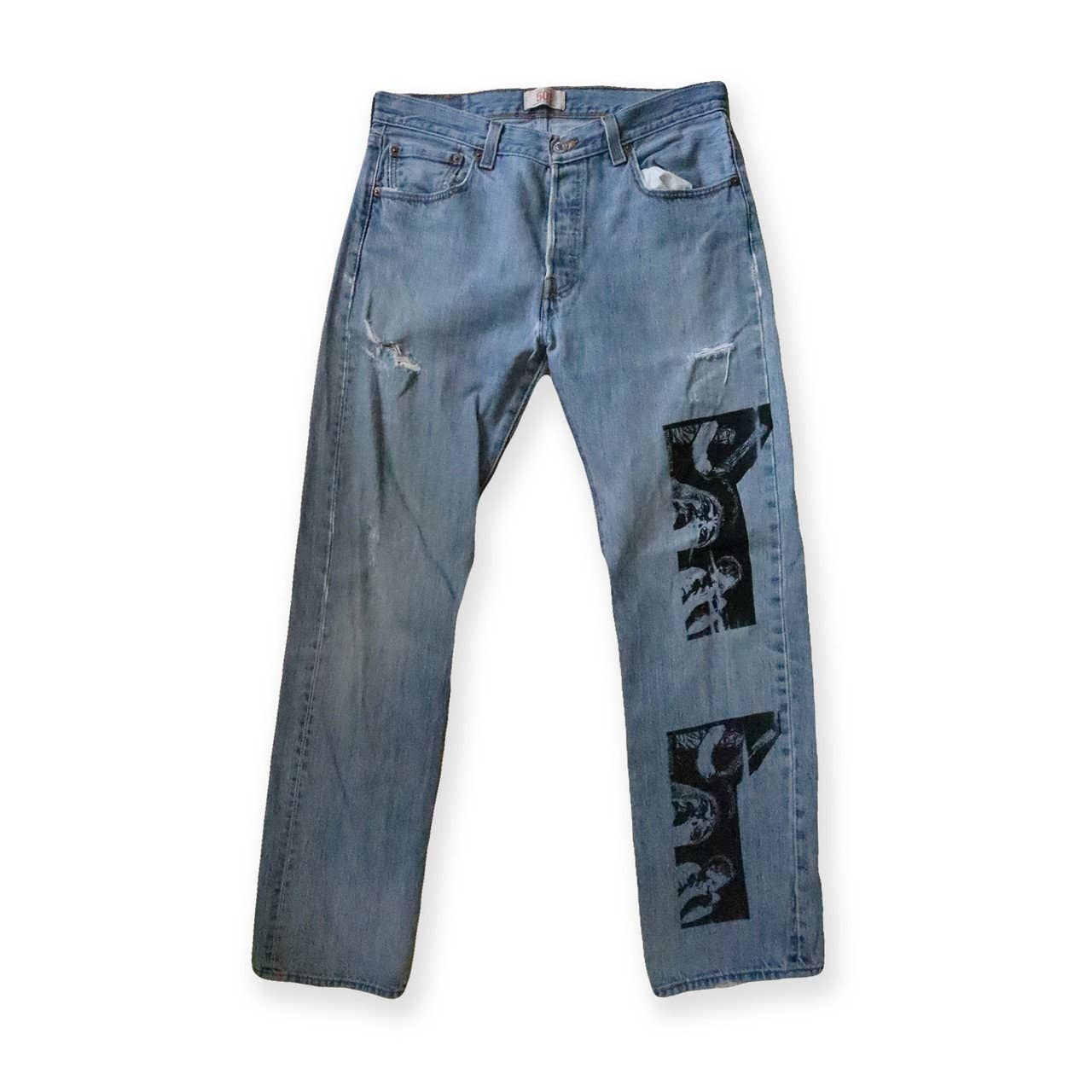 A straight fit denim pants featuring with utility cargo pockets and rip&repair details, 5 pockets construction and a center front zip-fly closure. SIZE 32 / WAIST(ROUND) 33" / INSEAM 32" / BOTTOM OPENING(HALF MEASURE) 7 3/4"
