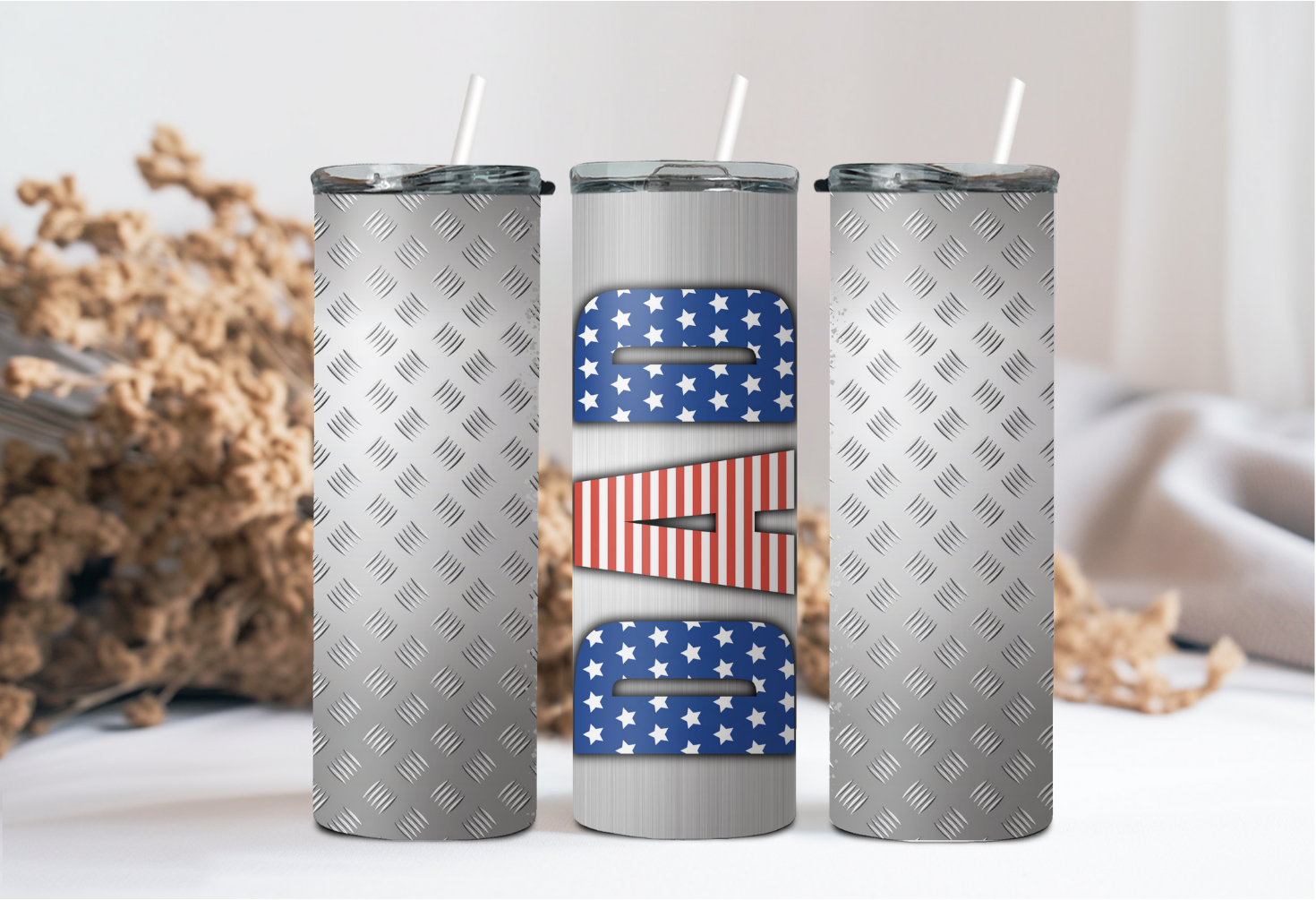 Our stainless steel tumblers are sublimated on 20oz skinny tumblers and come with reusable plastic straw. Since each tumbler is made to order, no 2 will be identical. These will not peel or fade.