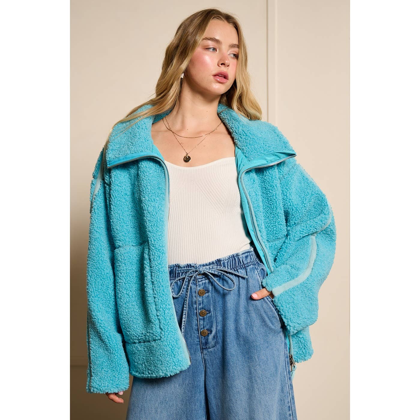 -Soft teddy bear fleece -Zip up hoodie -High collared neck -Oversize -Extra large front pockets -Imported Handwash Cold Model is 5'7" and wearing size Small