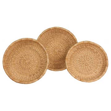 One of our best-selling signature plateaus baskets made in Rwanda with a one-of-a-kind handwoven design. * 12" W x 3" H * Hand dyed in multiple colors including olive green, blue, pink & natural * Made from strands of sisal wrapped around bunches of sweetgrass * Includes a loop on the back for hanging * Made from locally sourced fibers * The ideal housewarming gift and the perfect size to be used as a fruit basket, hung in a cluster on a gallery wall, or simply placed as an accent piece in your favorite nook around the house or office. *Due to the handmade quality, some size and color variation may occur. Impact The artisan sector is the second largest employer in the developing world. Yet the majority of artisans are women who lack access to export markets, business skills, and the financial tools needed to run successful, global enterprises. We are dedicated to changing that by investing 100% of our profits into education programs for the women who handcraft our products and youth in their communities. Since 2007, we've provided over 1,100 artisans and 250 young people in Rwanda & Ghana with employment opportunities, entrepreneurship training, and consistent access to the global export market. That's Impact. Care Instructions * spot clean * bright colors will fade in direct sunlight