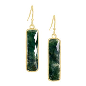 Natural hand-cut Prehnite set on gold-plated brass earrings with a quick-release clasp, crafted in India by skilled artisans whose jewelry-making tradition spans generations. Stone: Natural Prehnite – semi-precious; prized for fostering unconditional love, peace, and intuition Metal: Gold-plated brass earrings with lacquer finish to resist tarnish Origin: Handcrafted in India by generational artisans Artisanry: Precision hand-cut gemstone and fully hand-finished setting Uniqueness: Expect subtle shifts in pale green color hues, translucency, and the pattern of inclusions—each earring is truly one-of-a-kind. Pair effortlessly with denim, neutrals, or layered gemstone stacks, simplifying visual merchandising across styles. Prehnite’s serene, heart-opening energy resonates with mindful shoppers seeking meaningful accessories, while the tarnish-resistant finish keeps displays looking fresh.