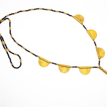 Odette reimagines the classic glass bead necklace with oblong and oval beads in a harmonious mix of colors. A slightly larger accent bead creates a gentle focal point, adding subtle contrast and rhythm. Modern, elegant, and effortlessly wearable, Odette is a fresh take on a timeless style. Materials: All metals are brass finished with plating (see below) Orbs for the GG, GA & GQ colorways are Tinted Glass *(Please note: these glass beads are sturdy and are not easily broken). Due to the glass-making process, each bead may have colour variations Finishing: *Slight variations may occur *Black Zinc on brass (*Nickel Free) Dimensions: *Slight variations may occur 1 mm brass snake chain, plating as noted above 0.75 mm plated brass chain used for the GG & GA colorways Approximately 17 1/2" long + extension, *Slight variations may occur Small glass orbs are 5/8" dia. Small bead: 1/2 x 3/4", Large Bead: 1/2 x 1-1/2" Our Process: All our pieces are designed and made in small batches in our studio in Toronto Why you’ll love them: • The matte finish of our pieces gives a understated and sophisticated charm