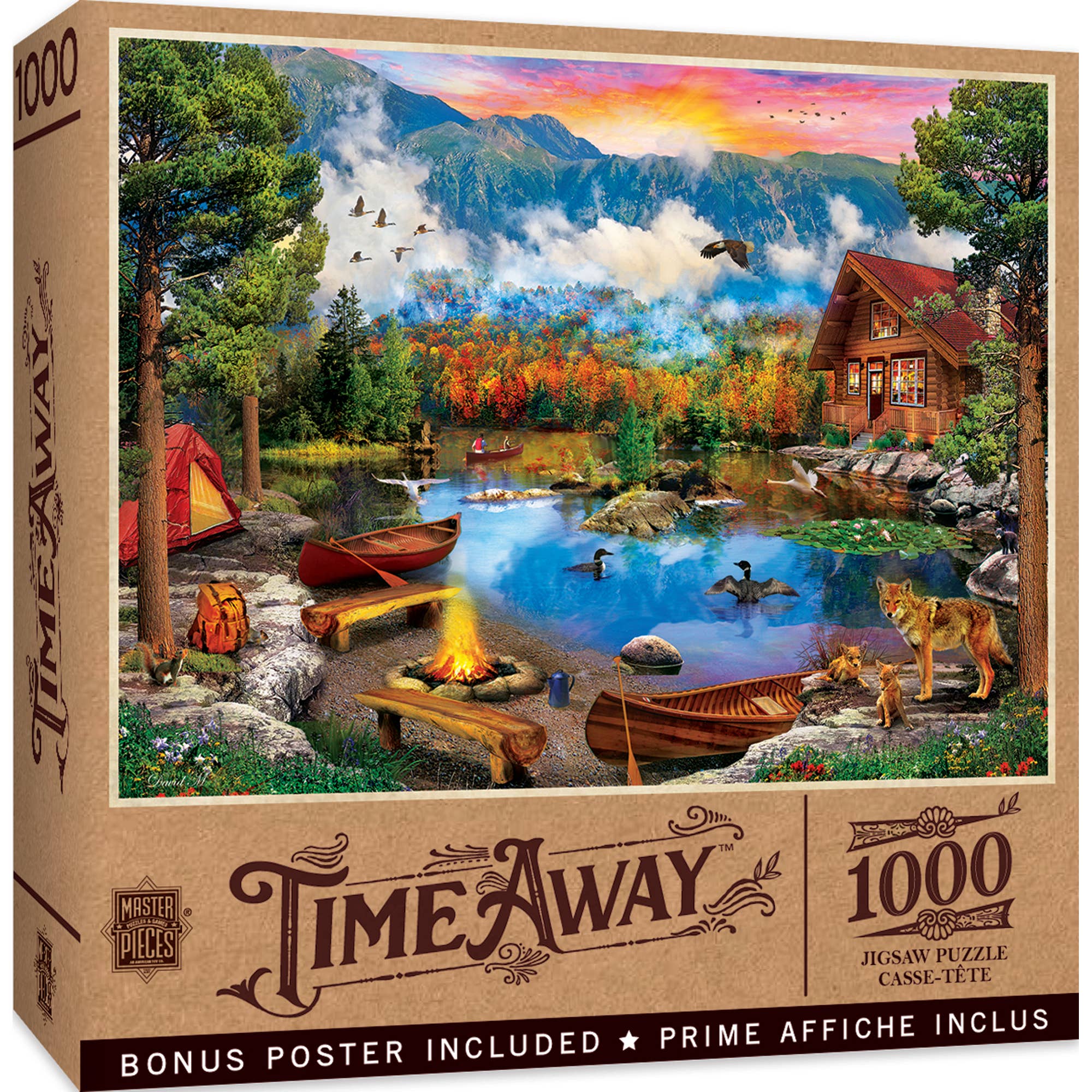 Ages 8+ MADE IN THE US: Cobble Hill Puzzles are proudly manufactured in the USA. RANDOM-CUT PIECES: This piece design means each puzzle piece looks different - A fun challenge. HIGH-QUALITY MATERIAL: The glare-reducing linen paper and crisp image make it a perfect piece to frame. EARTH FRIENDLY: All cardboard is made from 100% recycled material. Our ink is also vegetable based. NO INSTRUCTIONS REQUIRED: Simply use the box cover or convenient linen print poster included. Finished size is 26.625" x 39.25” Poster Size: 17.5" x 11.8" The tent is up, the campfire is burning, and the sun is setting. Is it sunset or sunrise at Canoe Lake?
