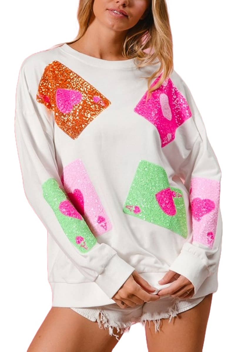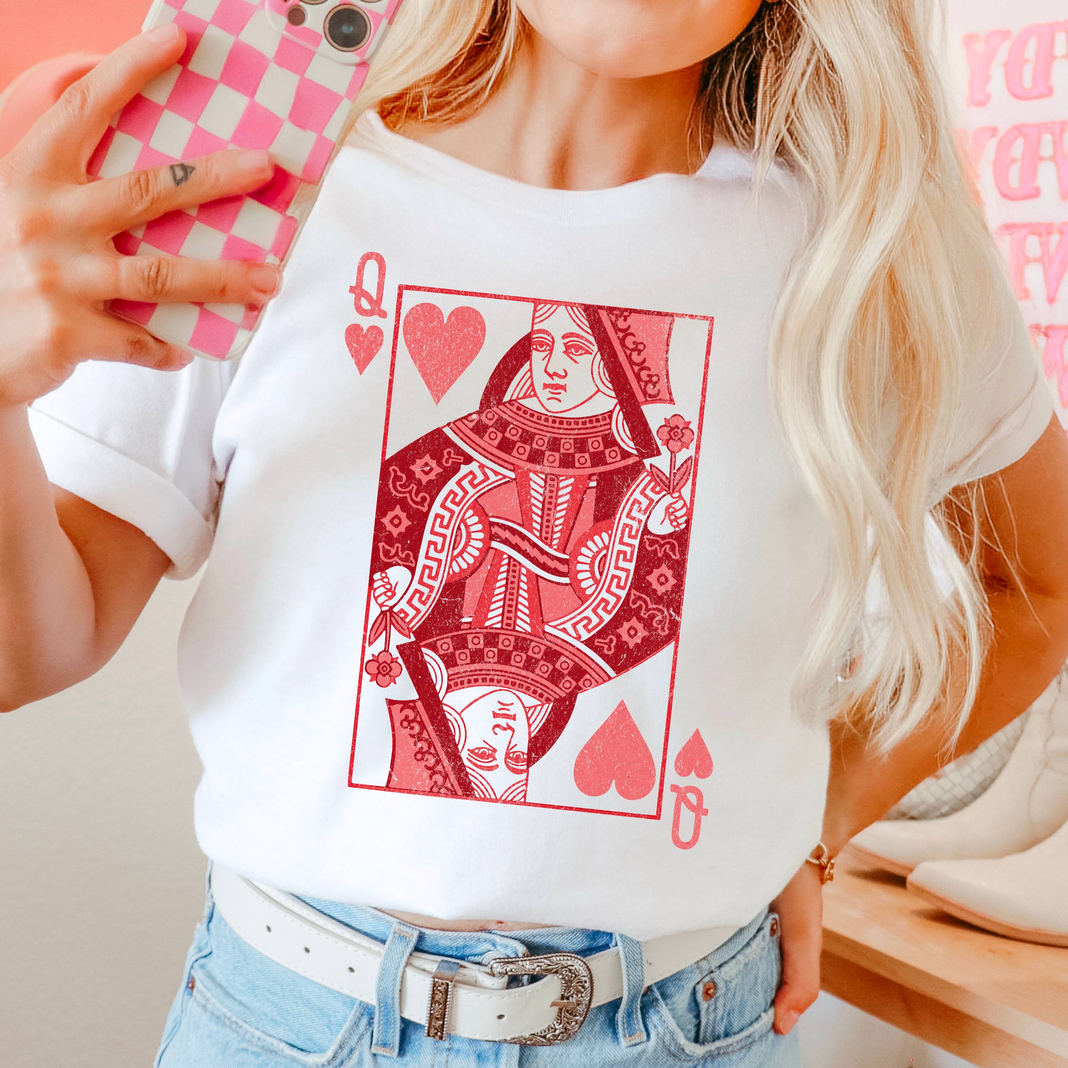 Queen of Hearts Valentine Graphic Long Sleeve T-Shirt * 100% cotton light pink long-sleeve t-shirt. * This graphic long sleeve shirt's design features a stylish queen of hearts playing card composition with sunglasses. Additionally, on each sleeve, there are three distressed heart shape images. This top is perfect for Valentine's season! * Application: The graphic of this top is applied using a direct-to-garment (DTG) printing method. We then apply the images on the sleeves with a direct-to-film (DTF) method. * Sizing Hint: We suggest ordering your regular t-shirt size for a roomy fit, but please refer to sizing charts available online to best determine the size for you. * Care Instructions: Machine wash cold. Do not bleach. Tumble dry medium. Do not dry clean. Let them know that they're dealing with the Queen of Hearts, and they need to bring their "A" game if they want to win your affections!
