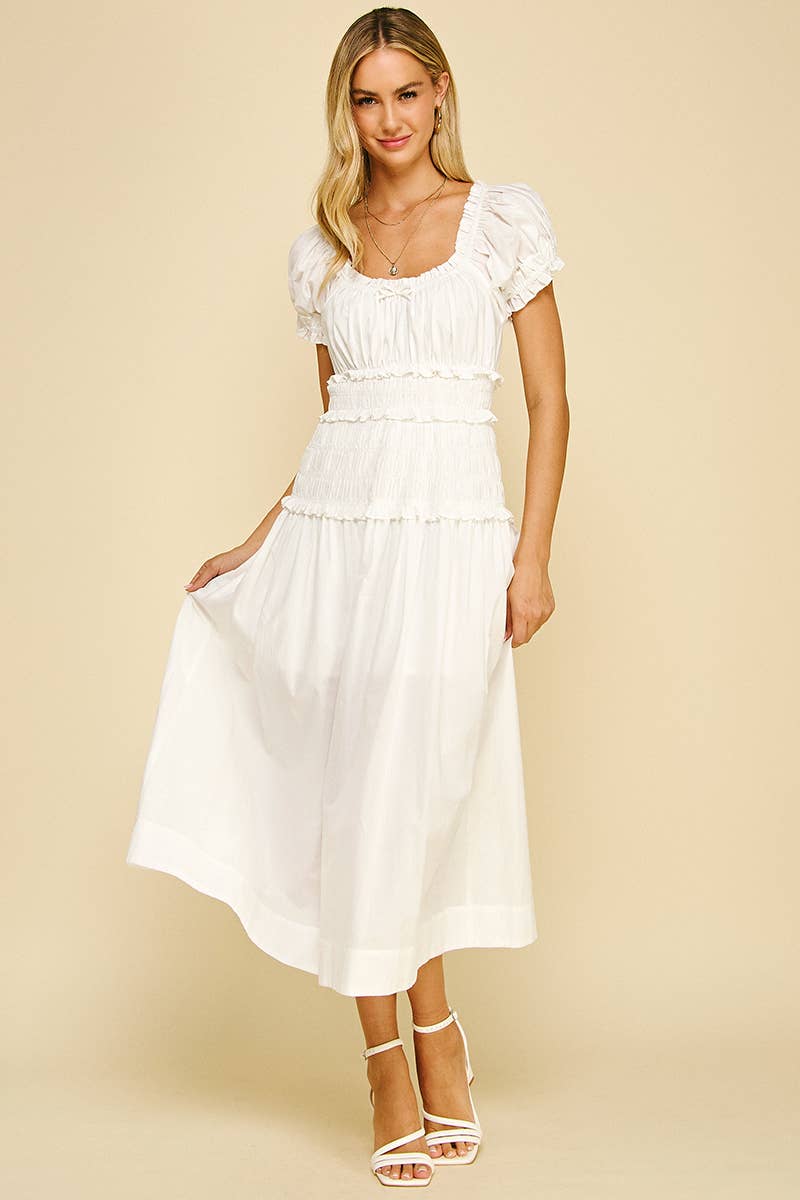 SWISS DOTTED RUCHED BODICE RUFFLE SHORT SLEEVE OPEN BACK TIRRED MIDI DRESS Model is wearing Small Height: 5'6" Bust : 32B Waist : 24" Hips : 32"