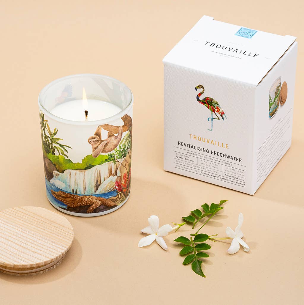 Soy candles with a purpose We are on a mission to save the planet's wildlife. Each candle sold protects 40 sq m (430 sq ft) of threatened habitat. Your purchase matters. Our candles are made with 100% American-grown premium soy wax (non-GMO, free from pesticides and herbicides) & top-of-the-line natural fragrance blends hand-crafted in Europe to enhance wellbeing and to capture the essence of the planet's biomes. Each candle comes with a 100% cotton wick and an FSC-certified wooden lid. Purifying Forest will help you create a peaceful atmosphere and fill your home with the aroma of balsam fir and princess pine with a delicate hint of forest berries that will bring memories of a quiet walk in nature. The unique look of our candles is achieved by printing hand-painted designs directly on each glass container, avoiding plastic or paper stickers and giving each candle an elegant matt finish. Our candles come in stylish plastic-free retail packaging. Hand-poured in Europe.