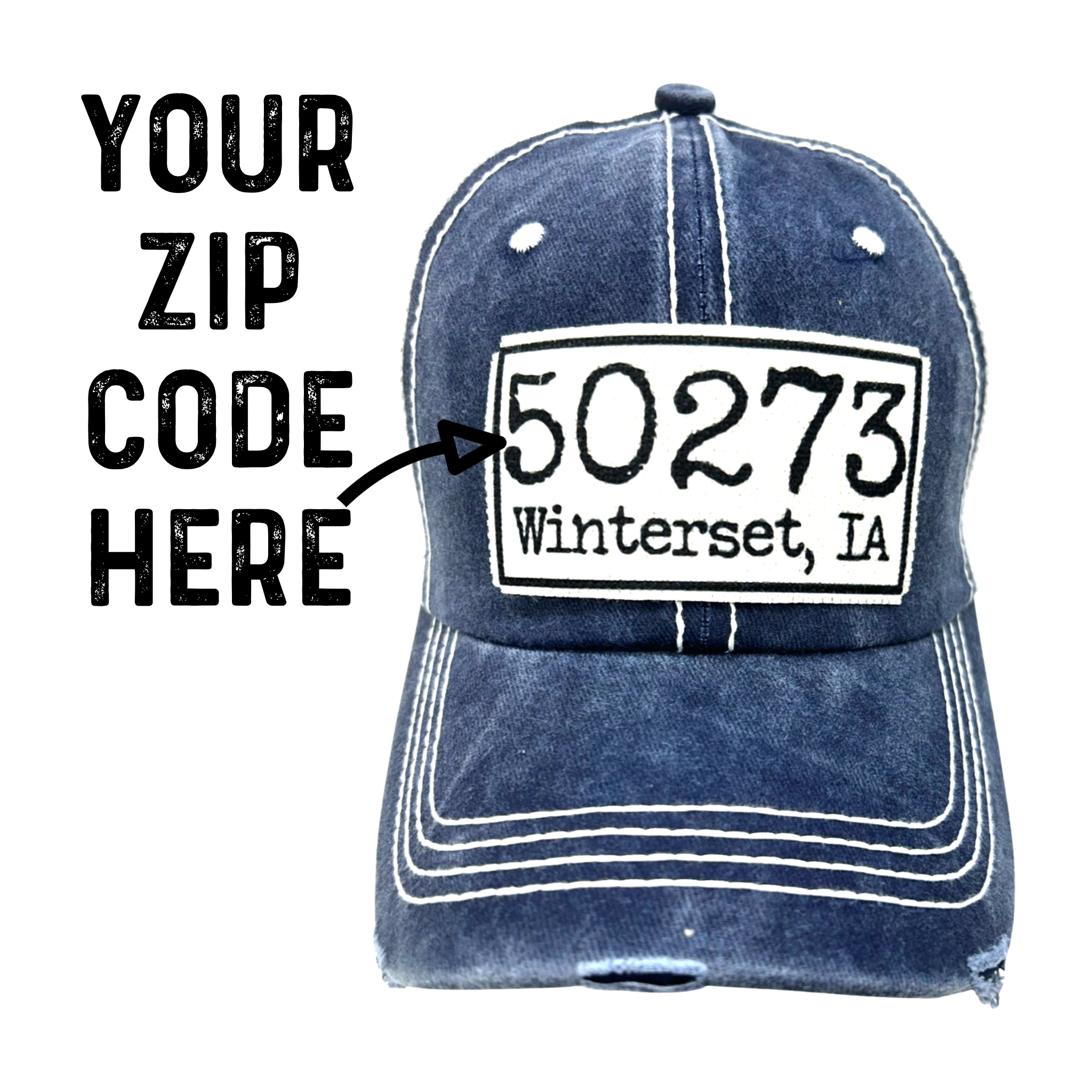 You can personalize one of our hats with zip code and your town, or nearby landmark. Just pick your hat styles colors and quantities and put your zip code, town or landmark, state in the customization text box. If you want just the zip code on the hat patch put only the zip code in the customization box, we will put exactly what you specifically requested on the patch. We may change the font to better fit the space on the patch but will be in a similar style. If you need a proof sent prior to printing please message us first. This listing is for a personalized hat with the pictured design only, we do not provide custom hats. *MINIMUM- We would like a minimum of a total of 6 Pieces per design ordered on our custom hats. Reorders can be any quantity- thanks! • Professionally printed in Iowa (Note- Hats themselves come from companies outside of U.S. but we print and apply the patch)
