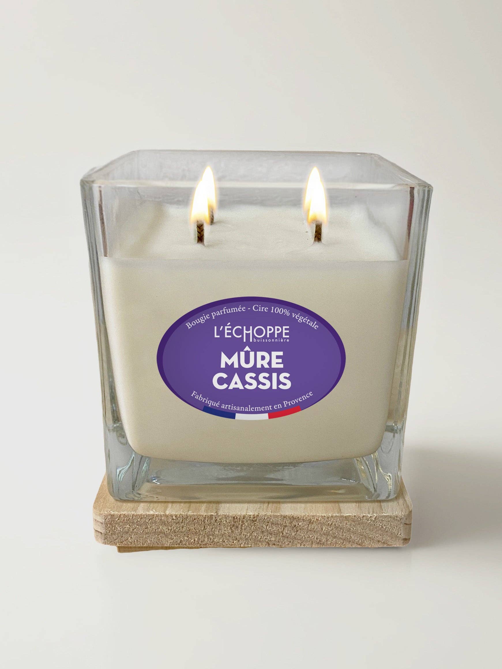 SQUARE GLASS JAR Wooden lid made in E.S.A.T. Scented candle 100% vegetable soy wax 4 cotton wicks Burn time 65 h Net Weight: 400g Grasse fragrance Made in France