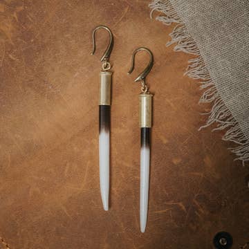 These striking porcupine quill earrings are made from shed South African Porcupine Quills and natural turquoise stones. Tips of the quills are capped with brass beads for safety. They dangle at 4.25" to 5.5" in total length. Earwires are antique-brass. 14K gold-plated earwires are available by request. Due to the natural materials used, quills will vary slightly in length and color from the images here. Rest assured that each quill is hand-picked by the designer, and earrings can be easily exchanged if unsatisfactory. Turquoise stones occur in a variety of beautiful colors and shapes. Please message if you prefer lighter or darker color stones and I will do my best to accommodate. No animals were harvested to make these earrings.