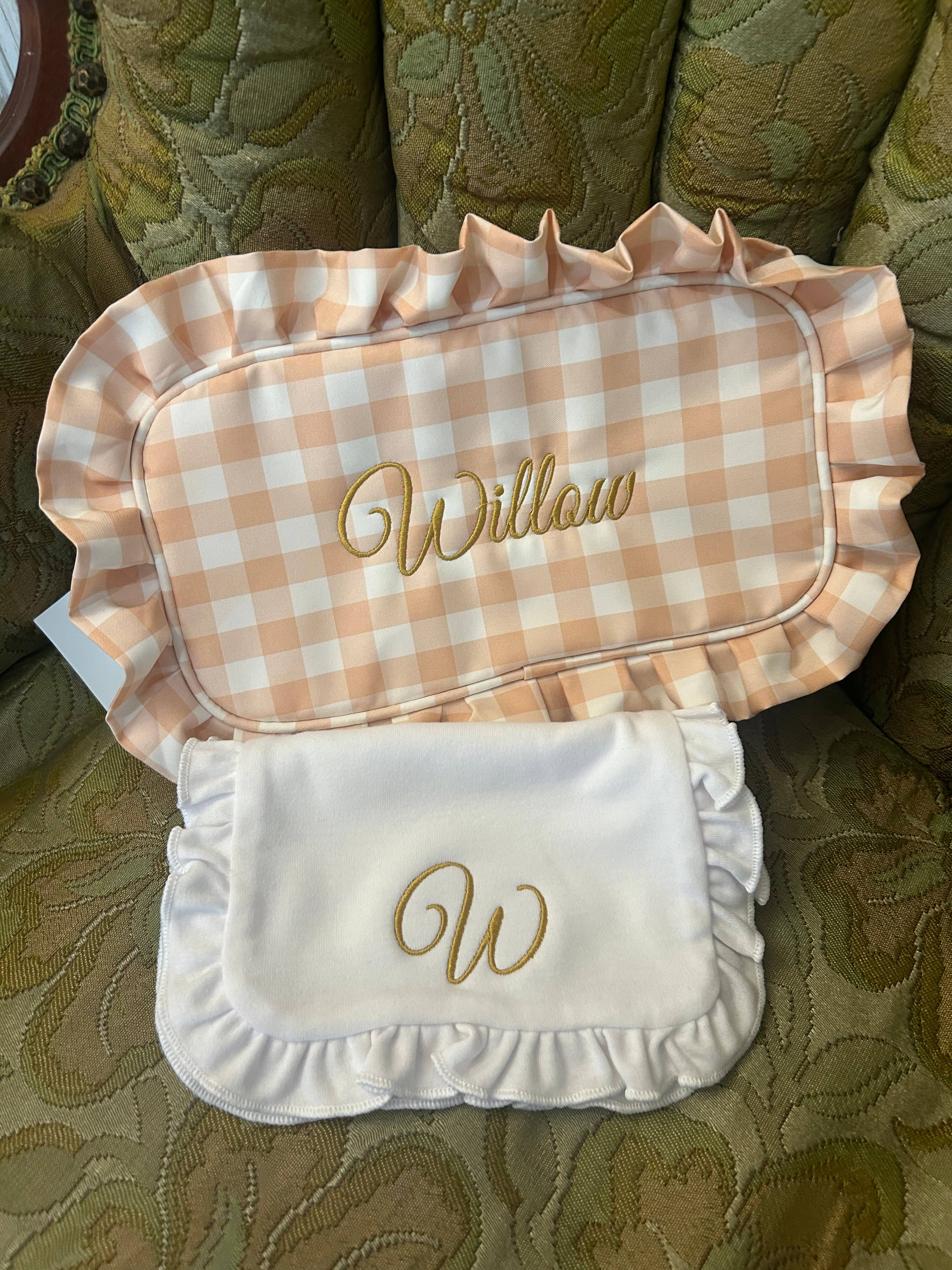Our bestselling gingham ruffle pouches are boutique favorites for good reason. With a flat front panel perfect for embroidery or heat press, these zippered cosmetic bags are ideal for monogramming and personalized gifts. Available in multiple vibrant colors, they’re a go-to for makeup storage, travel organization, or bridesmaid gifting. Lightweight, durable, and display-ready, these pouches are a top seller for gift shops, embroidery businesses, and curated general stores. Details: * Measurements: Approximately 10 x 5 x 2 inches * Gold Zipper * Gingham print * Lining on the inside for easy cleanup * Letters sold separately