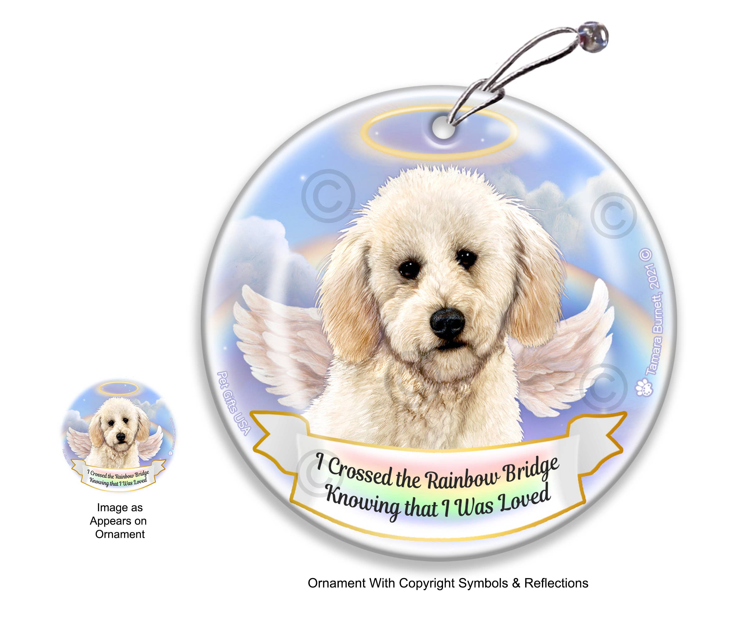 "Barking, Playing, an endless run. I'm up in heaven having fun." Hanging ceramic bereavement ornament