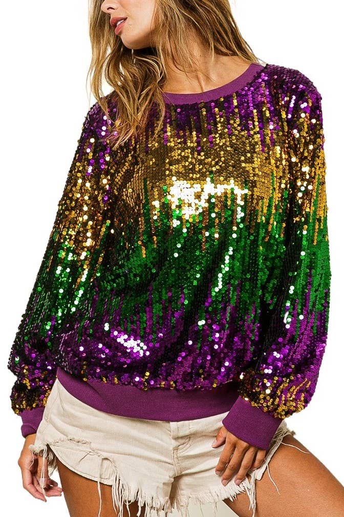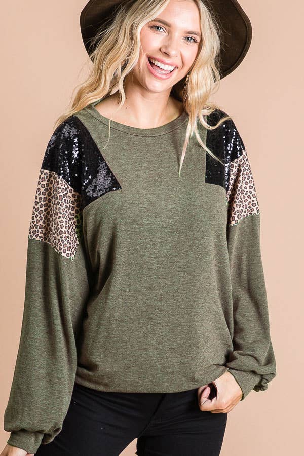 Solid Body Fashion Top With Shimmer Metallic Sequin Contrast Bubble Long Sleeves And Cuff Detail